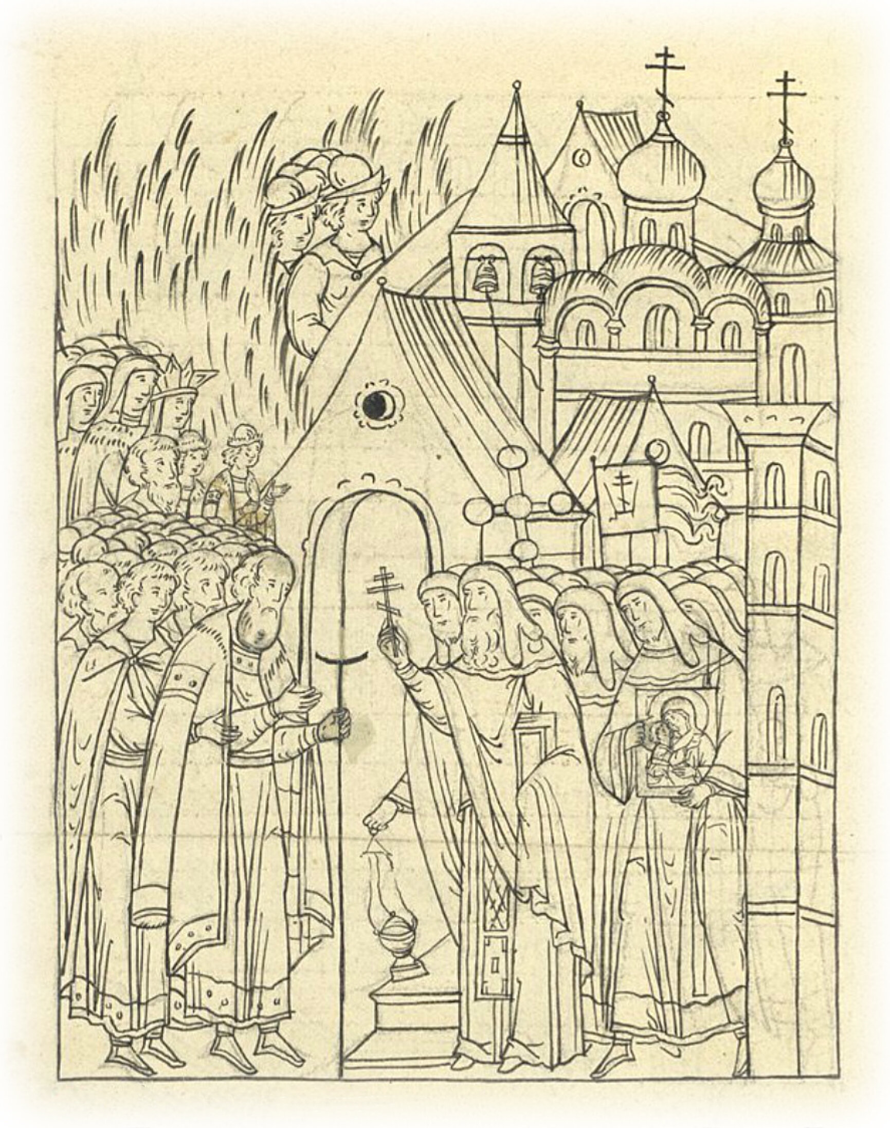 Наутро же пришли в Иосифов монастырь к Пречистой молиться, гробу игумена Иосифа поклониться; и встретили великого князя игумен с братьею и со священниками и весь клир церковный в воротах монастыря с иконами и с кандилами.