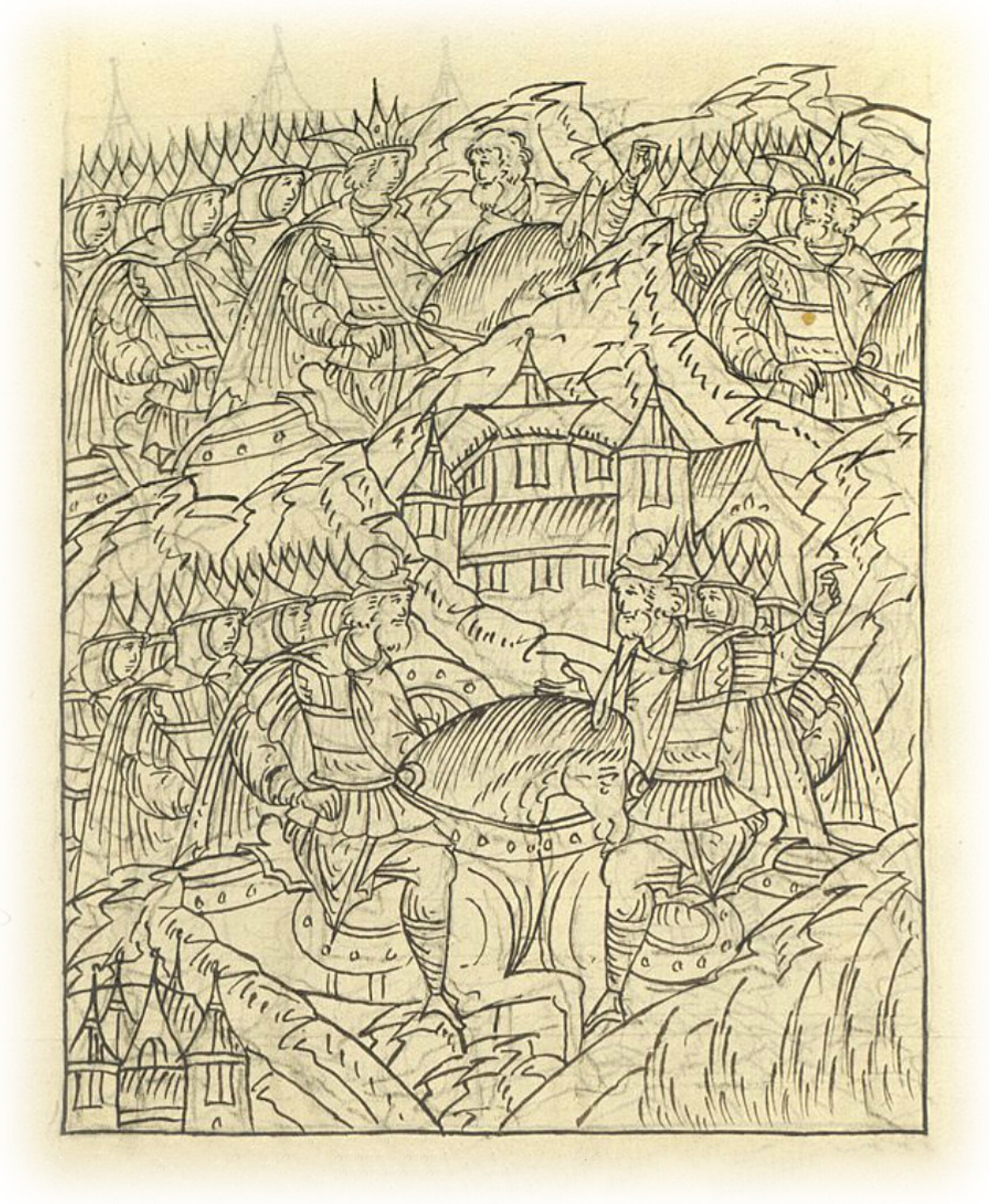 Языки говорят воеводам царя Ивана Васильевича, что магистр окопался большим рвом вокруг города Рындола, бьет из пушек и пищалей и приступает к Рындолу.