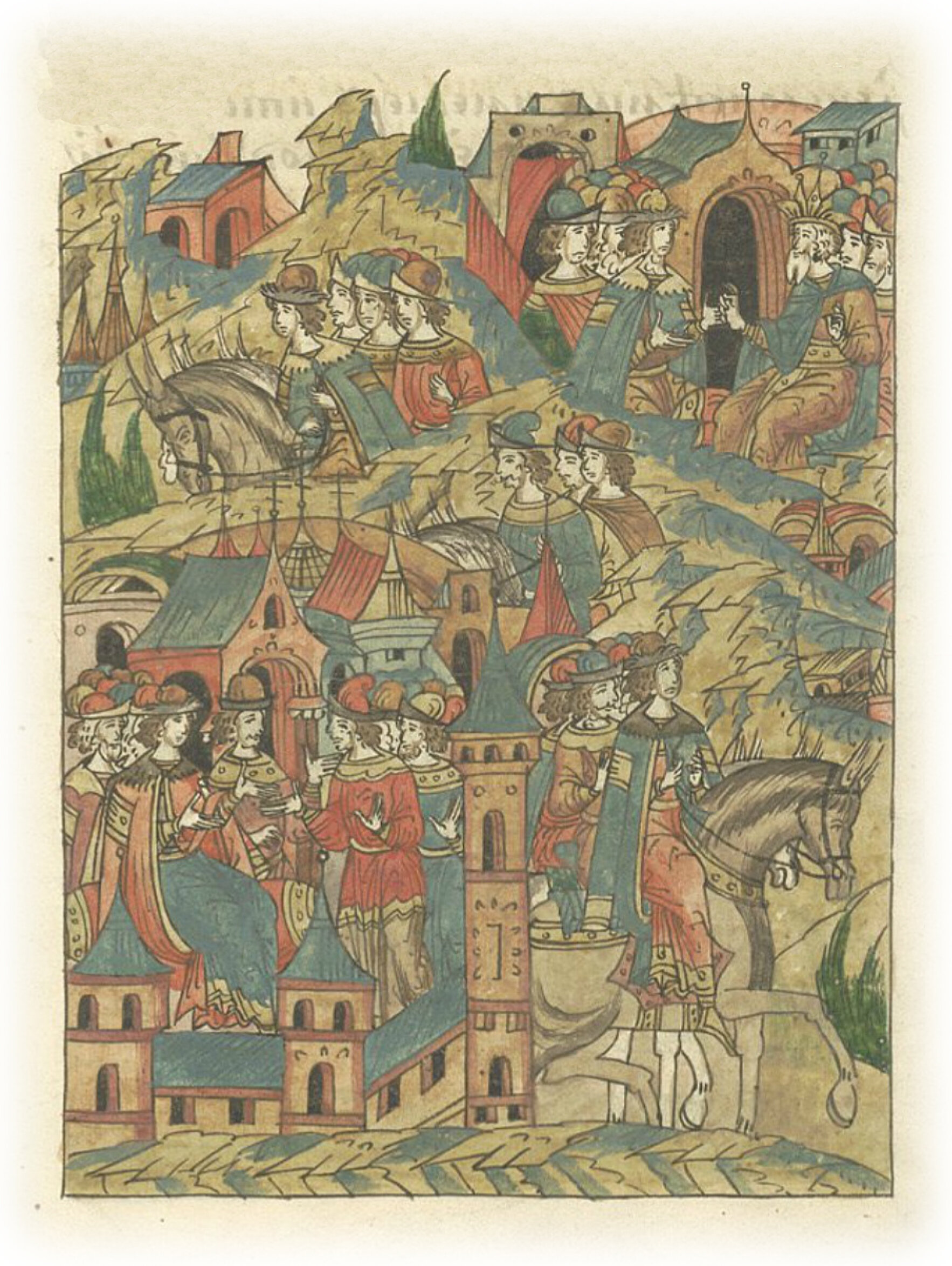 И вот пришел посол из Орды от царя Тохтамыша и позвал великого князя Василия Дмитриевича и посла своего в Орду. Великий князь пошел к царю в Орду и принят был с почетом царем Тохтамышем, как ни один из прежних князей. И передал ему царь Тохтамыш Нижний Новгород и Городец со всем, Мещеру и Тарусу, и сильно полюбив, милостиво отпустил на Русь.