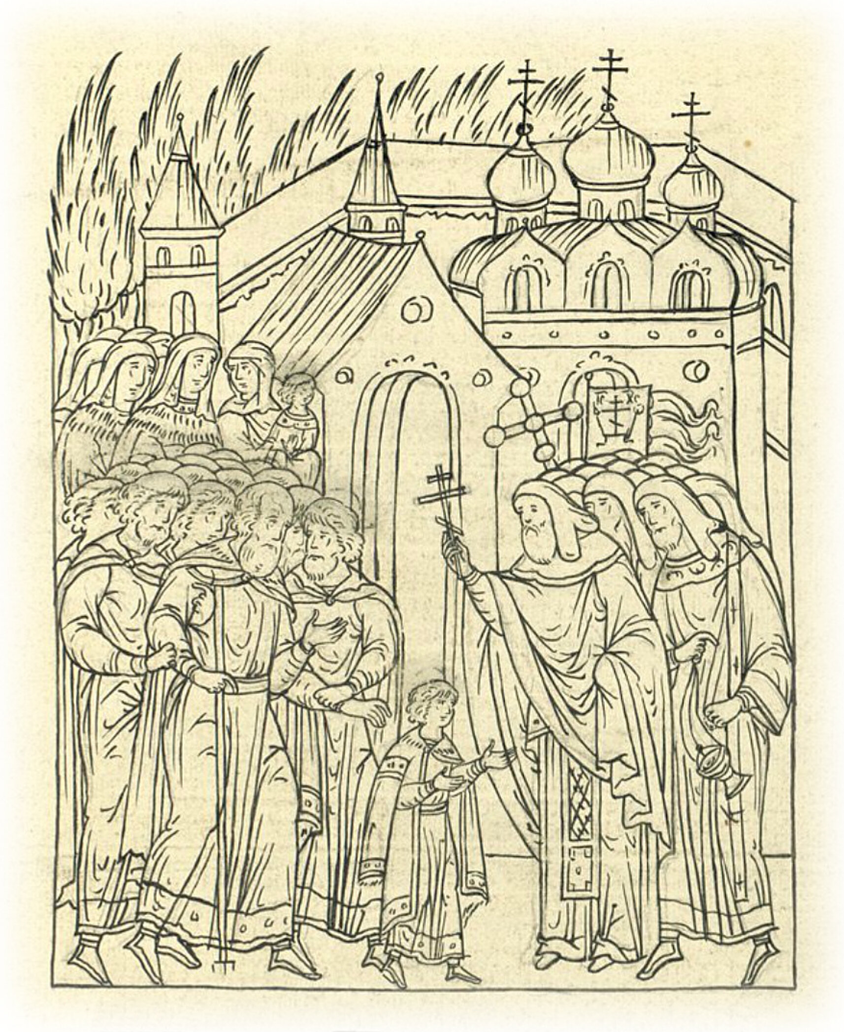 Когда же приехал в Иосифов монастырь, то, как его встретил игумен с братьею, и тогда великого князя взяли те двое под руки, князь Дмитрий Шкурлятев да князь Дмитрий Палецкий, и пошли к храму Пречистой.