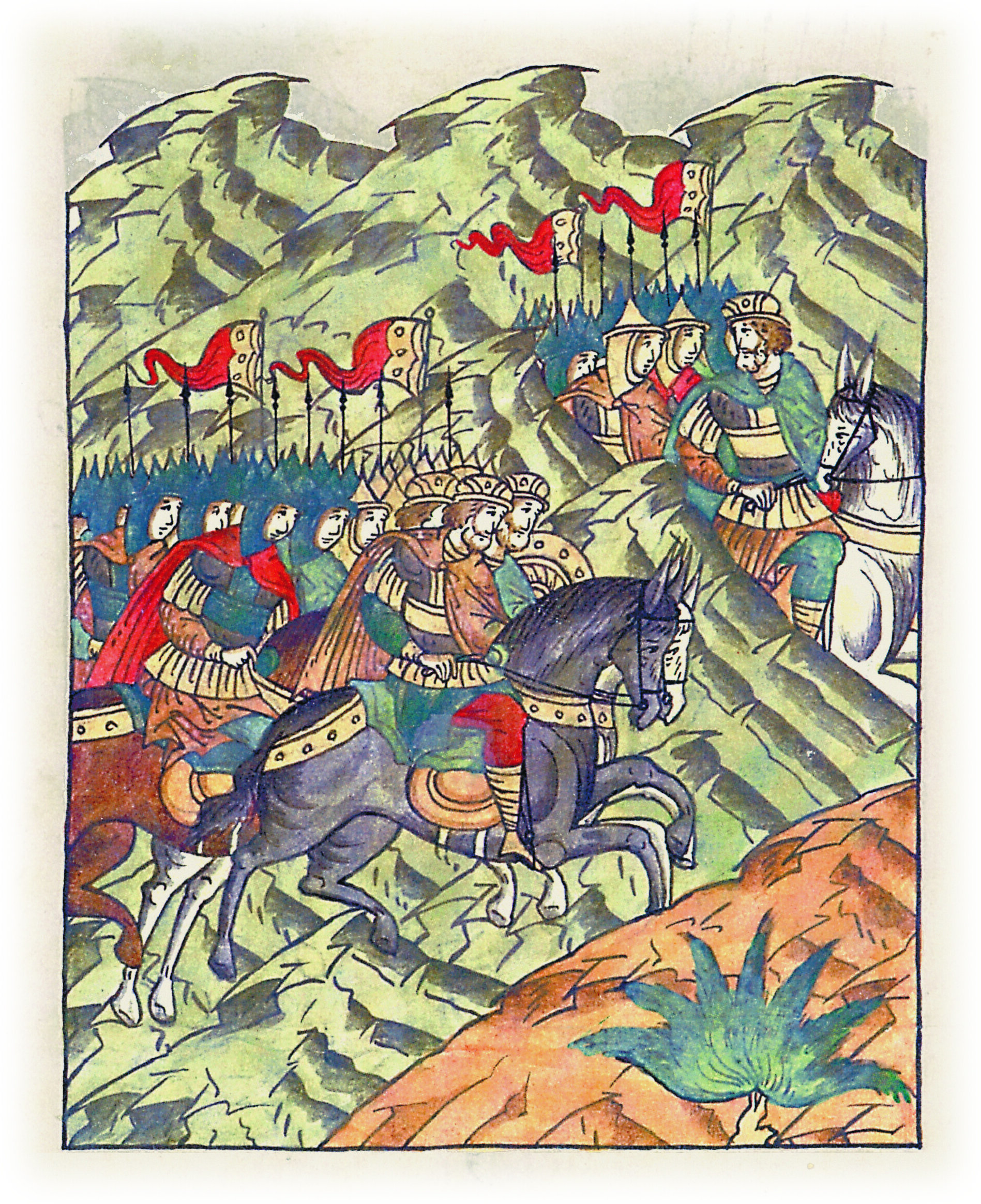 Воеводы царя Ивана Васильевича, разделившись, идут в погоню за царем Емгурчеем.