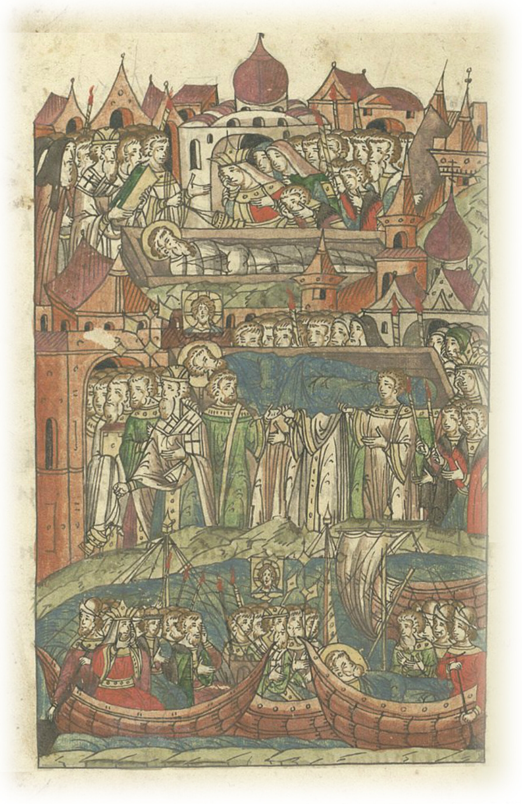 Тело князя Михаила Ярославича Тверского встречают в насадах на Волге его сыновья и княгиня, а также епископ Варсанофий со всем священническим чином и множеством народа, и кладут его в церкви святого Спаса. Несмотря на долгую дорогу, тело князя было цело и