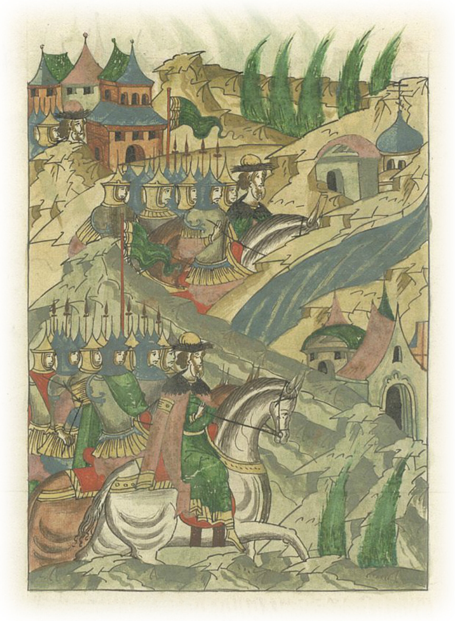 Воеводы царя Ивана Васильевича, разделившись, идут в погоню за царем Емгурчеем.