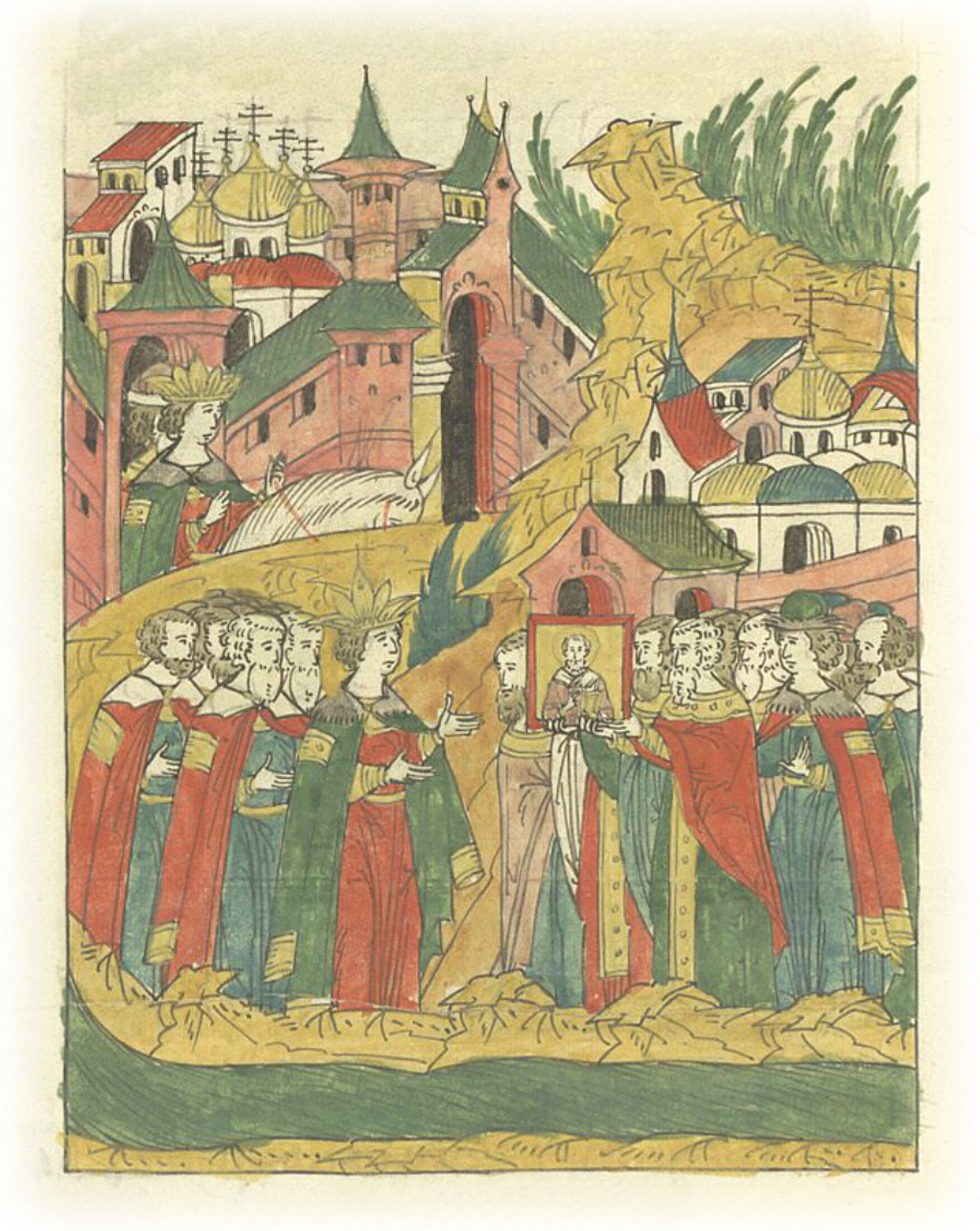 Когда же принесена была икона святого чудотворца Николы близ царствующего города Москвы на Симонове, и тут встретил ее великий самодержец Иван Васильевич с великой верой и со многим желанием /за Новым городом/.