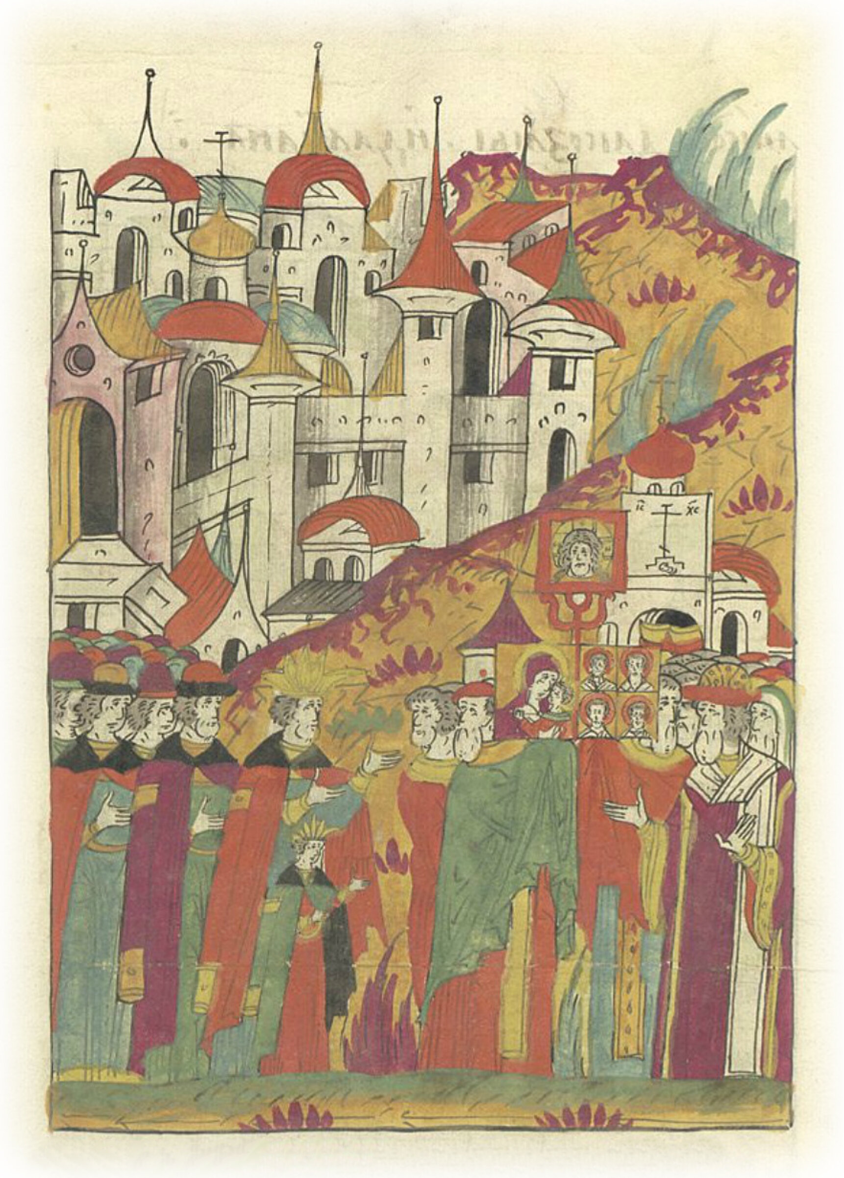 И царь и великий князь и его сын царевич Иван Иванович, и его брат князь Юрий Васильевич, и митрополит Макарий со всем освященным собором, и весь царский синклит*, и множество народа встретили иконы у церкви Пятницы Ржевской. * совокупность придворных, знать в Московском государстве.