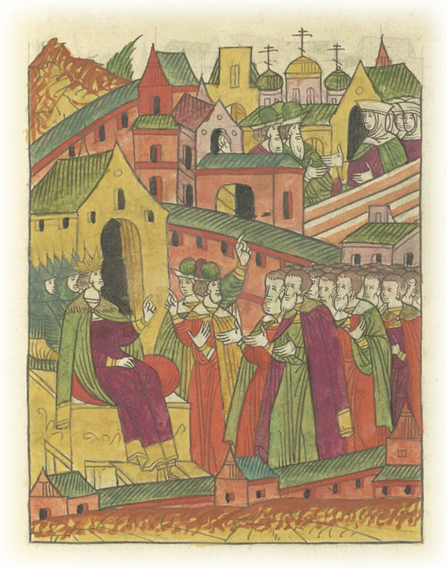 Ругодивские посадники Яким и Захар приезжают в Москву. Воеводы царя Ивана Васильевича Алексей Адашев и Иван Михайлов сообщают им, что государь пожалует их, если сдадут его воеводам помимо Ругодива Вышгород.