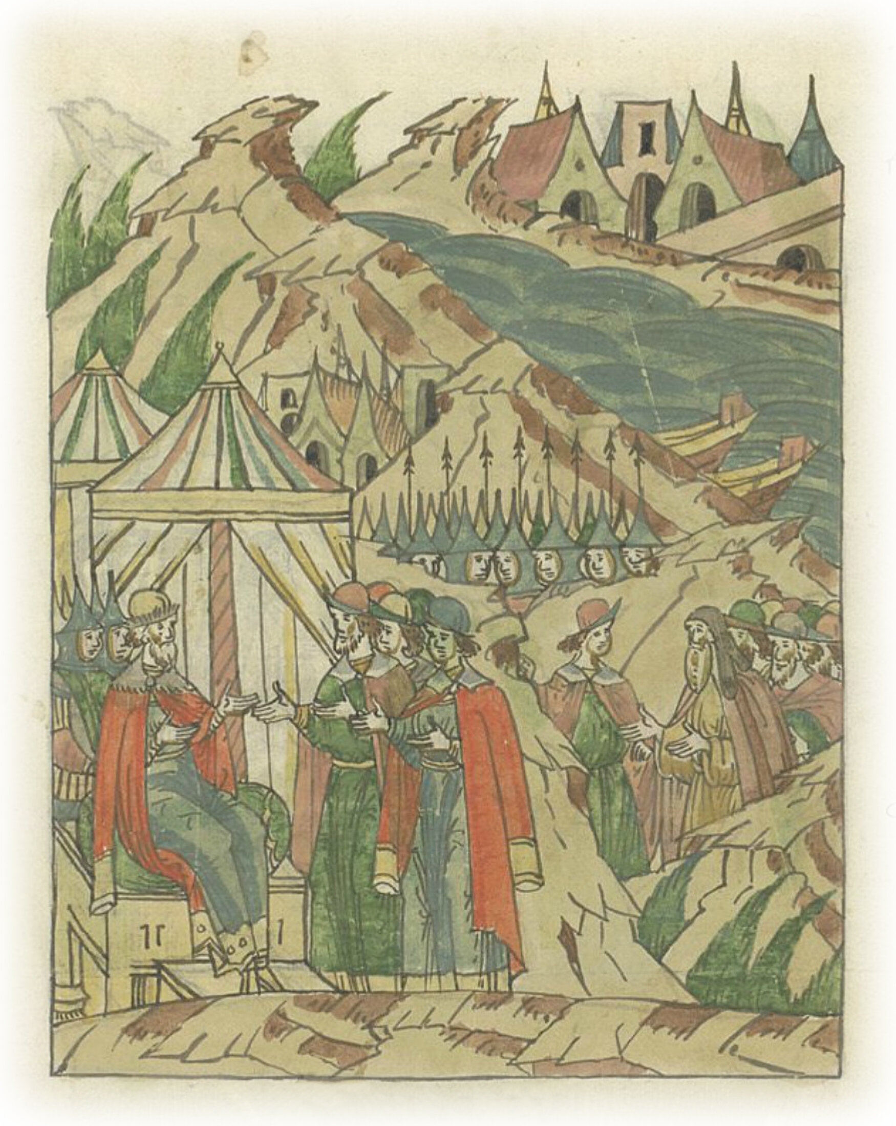 Великий князь Иван Васильевич принимает моление своих братьев и бояр и велит нареченному владыке Феофилу, новгородским посадникам, тысяцким и прочим людям идти к нему.