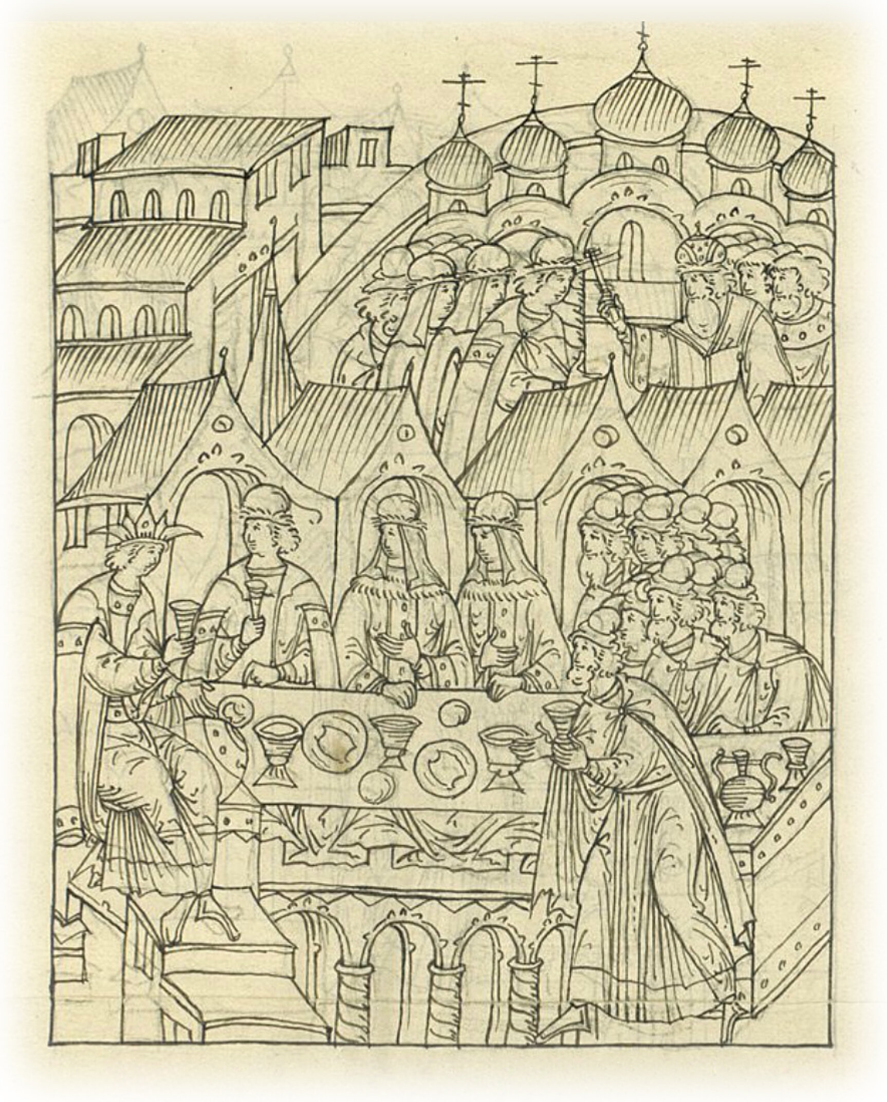 В ту же весну (месяца) мая в 18 (день), в шестое воскресенье после Пасхи, царь и великий князь Иван Васильевич всея Руси пожаловал князя Владимира Андреевича, женил его, взял за него дочь Александра Нагого Евдокию; а свадьба князя Владимира Андреевича проходила на дворе у царя и великого князя, и венчал их Макарий, митрополит всея Руси, в соборной церкви Успения (Пресвятой) Богородицы.
