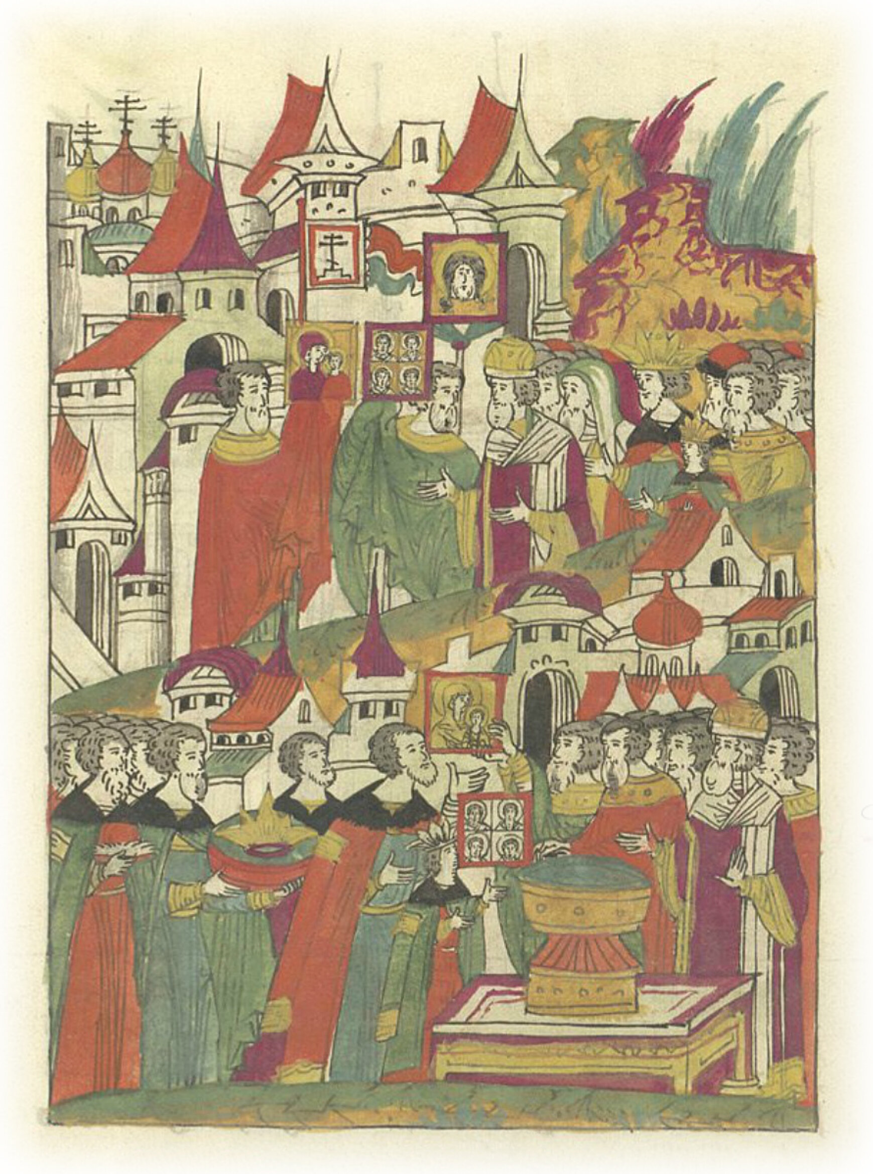 Привезение в Москву из Ругодива икон Пречистой богоматери и Николы чудотворца. Отслужив молебен в церкви Пятницы Ржевской, встречающие идут с иконами в город.