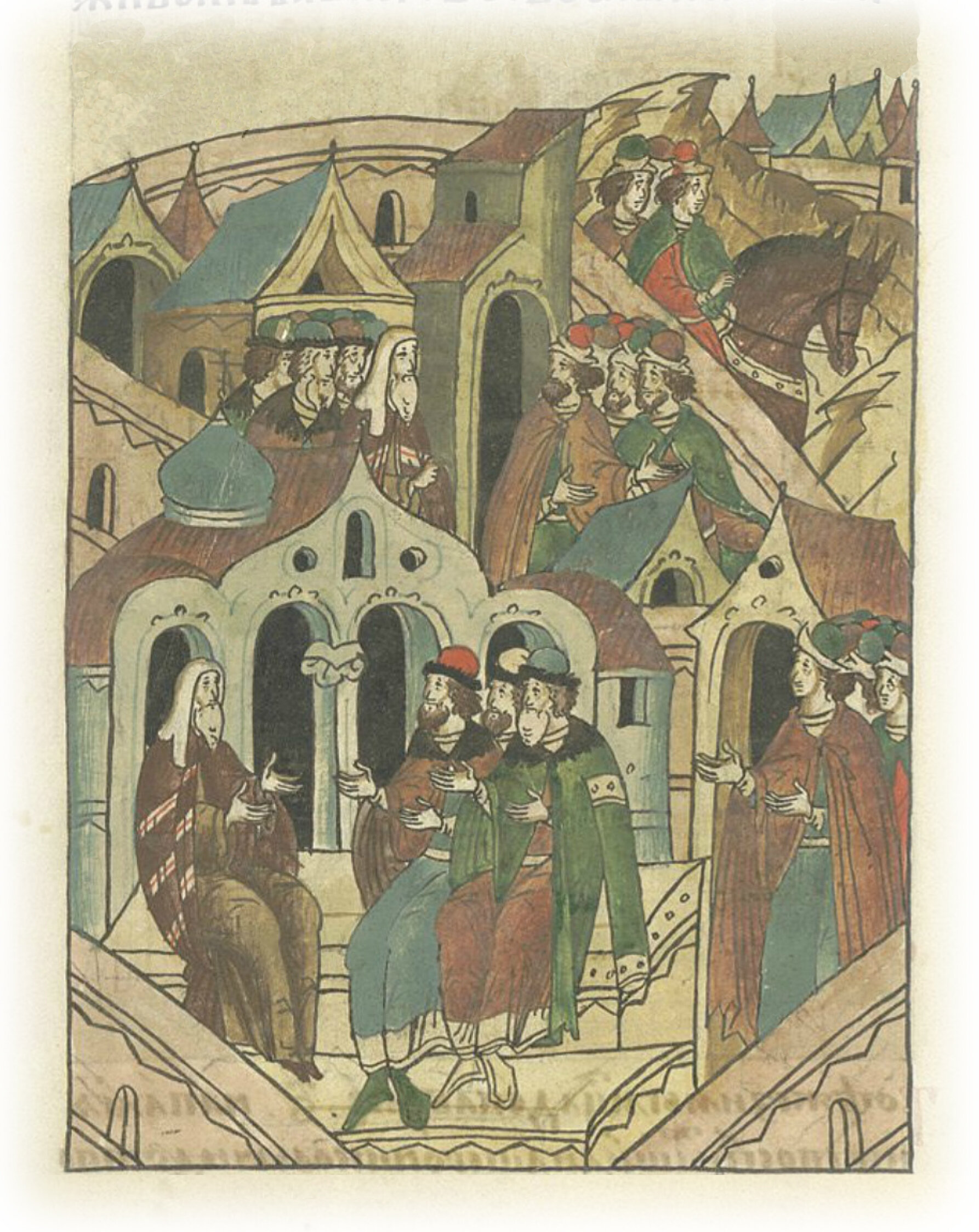 Потом, посоветовавшись с сыном своим духовным великим князем Семеном Ивановичем и с братьями его, с князем Иваном Ивановичем и с князем Андреем Ивановичем, с боярами и с вельможами, послали послов своих в Царьград: от великого князя послы – Дементий Давыдович да Юрий Воробьев, а от митрополита послы – Артемий Коробьин, да грек Михайло Щебратый. Они должны были просить, чтобы не ставили им никого на Русь в митрополиты, кроме преподобного старца Алексея, который был наместником и был во всем добродетелен и честен, и был он старцем преосвященного Феогноста, митрополита Киевского и всея Руси.