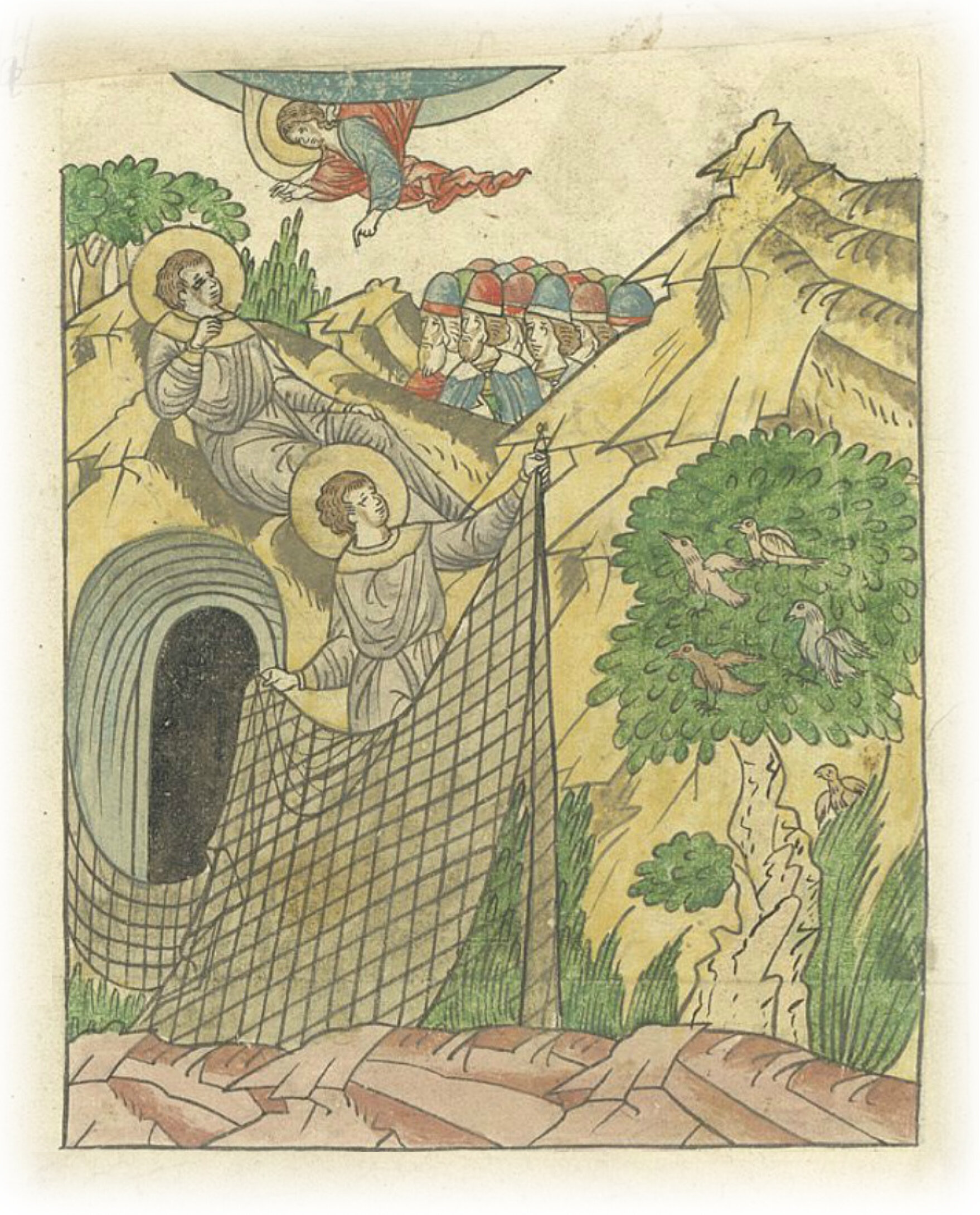 Исполнилось ему двенадцать лет, и было ему видение, так как Бог хотел явить свою волю о нем, расставил он силки для ловли птиц и немного задремал, и был ему голос, говорящий: «Алексий, зачем понапрасну трудишься? Отныне будешь ты ловцом людей».