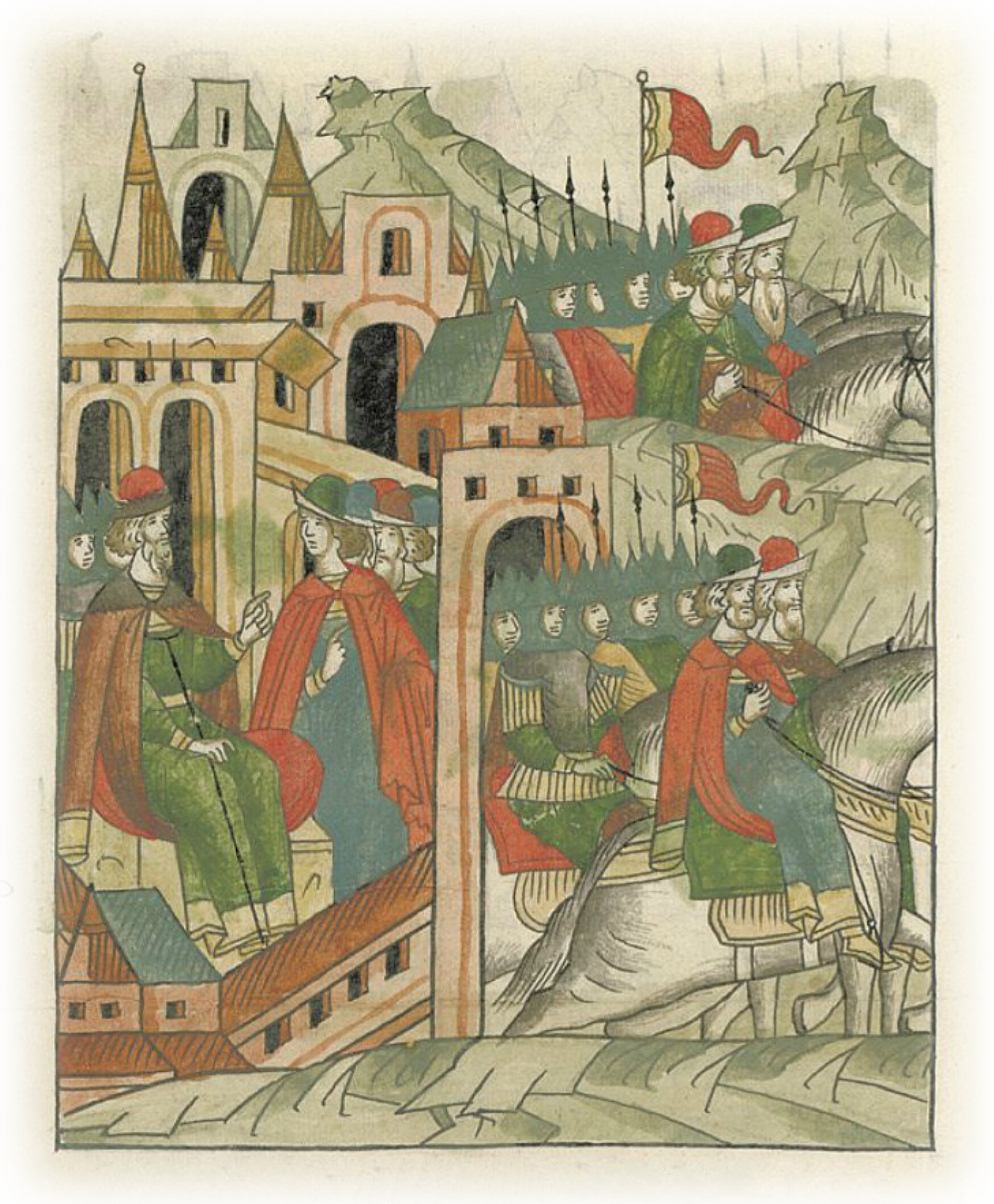 И после этого великий князь послал князя Даниила Васильевича Щеню и князя Александра Васильевича Оболенского, и других воевод со многими людьми завоевывать немецкие ливонские земли за их неправду, за то, что они завоевывали его вотчину Псков и его купцов захватили в Юрьеве.
