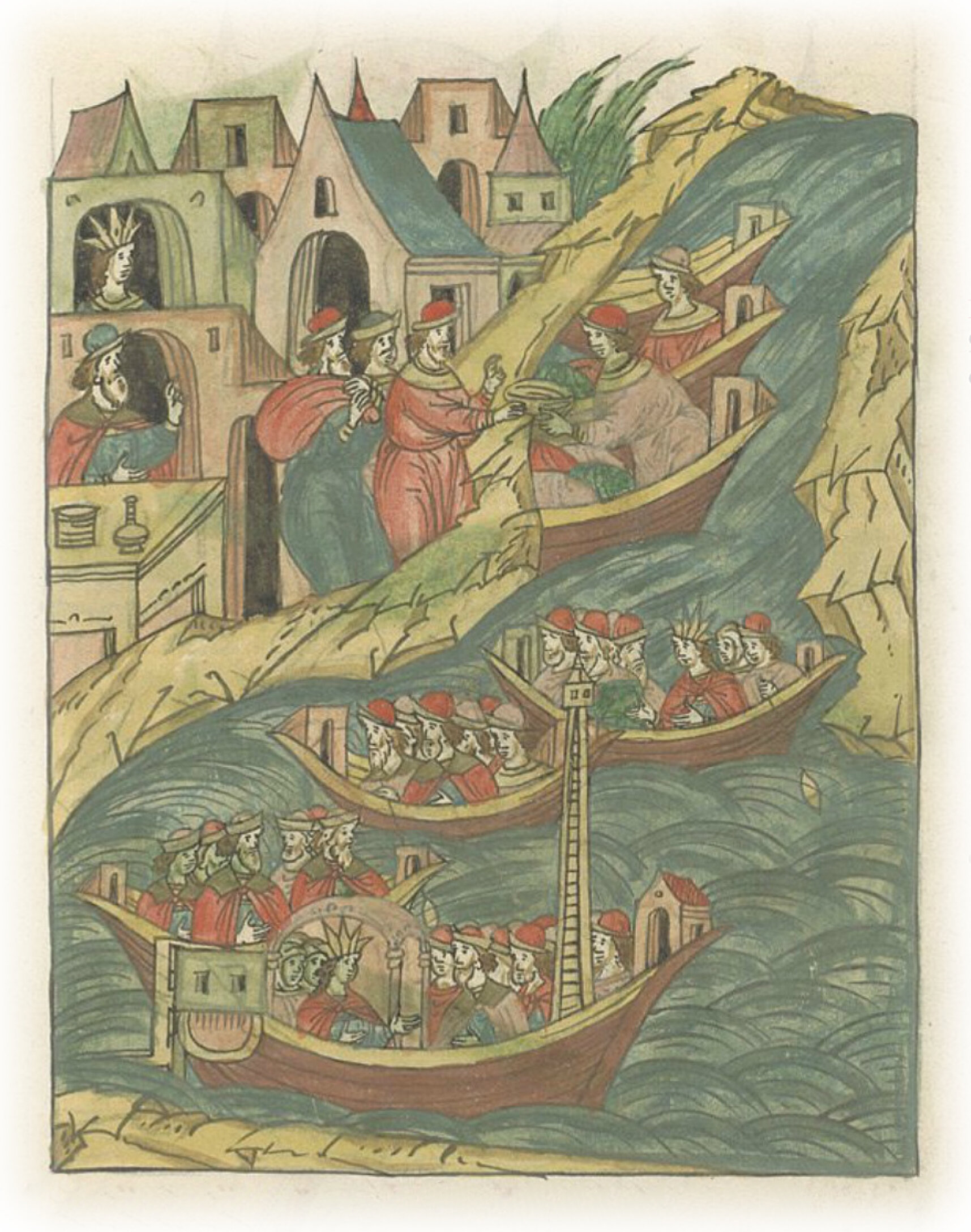 Фрязи и греки из Рима приходят с царевной Софьей в немецкий город Любческ. Пробыв там 8 дней, идут к кораблю.