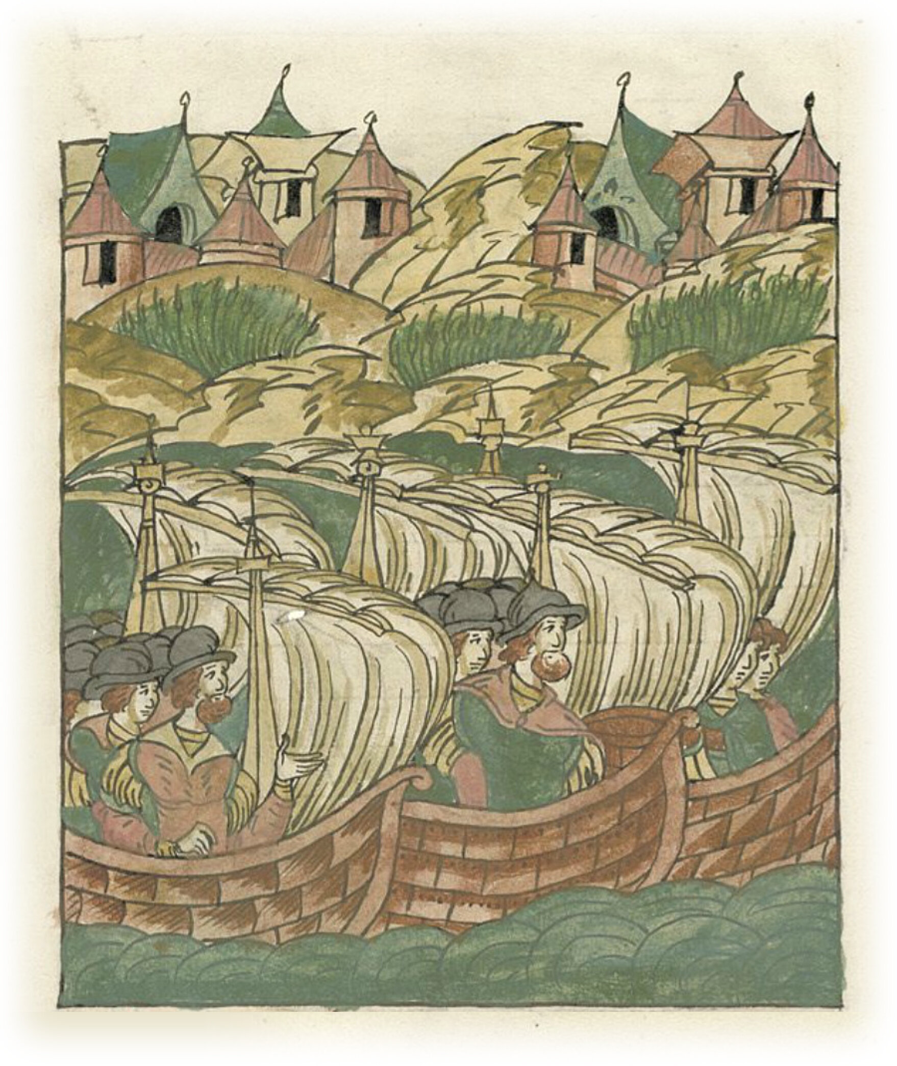 Немцы, узнав о голоде в Русской земле, привозят на кораблях зерно и муку в Новгород.