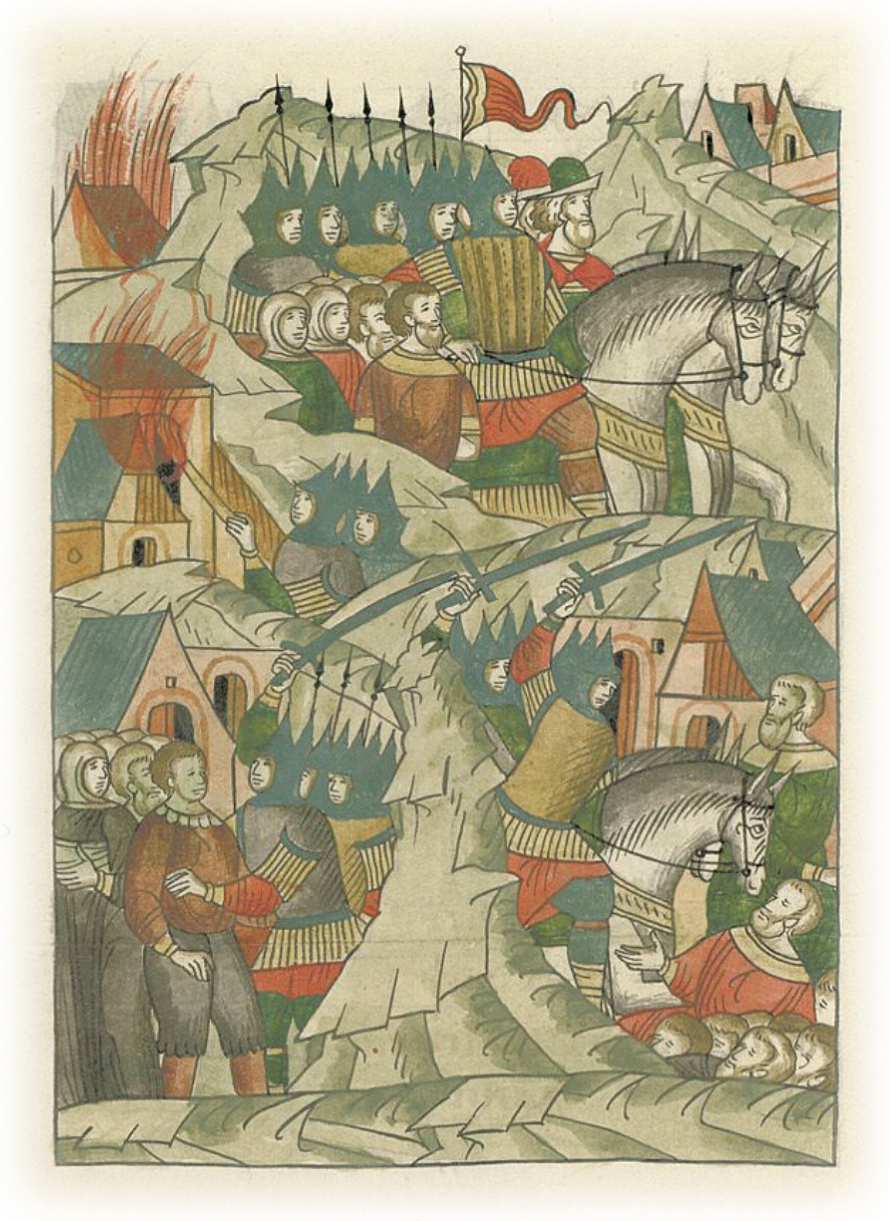 Воеводы великого князя Ивана Васильевича идут завоевывать немецкие земли, сжигают их, убивают и уводят в плен людей.