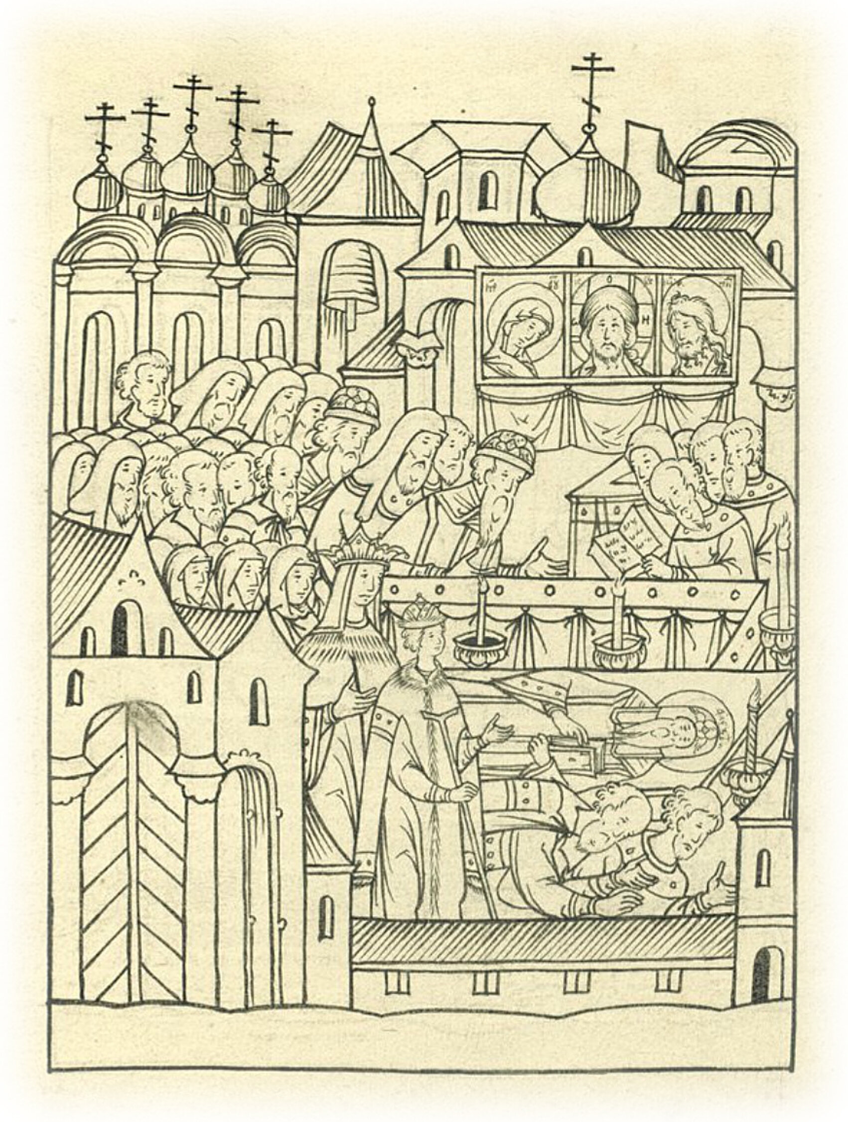 Великий князь Иван Васильевич и его мать великая княгиня Елена с митрополитом всея Руси Даниилом и епископами совершают молебен, чтобы переложить мощи чудотворца Алексея в новую раку.