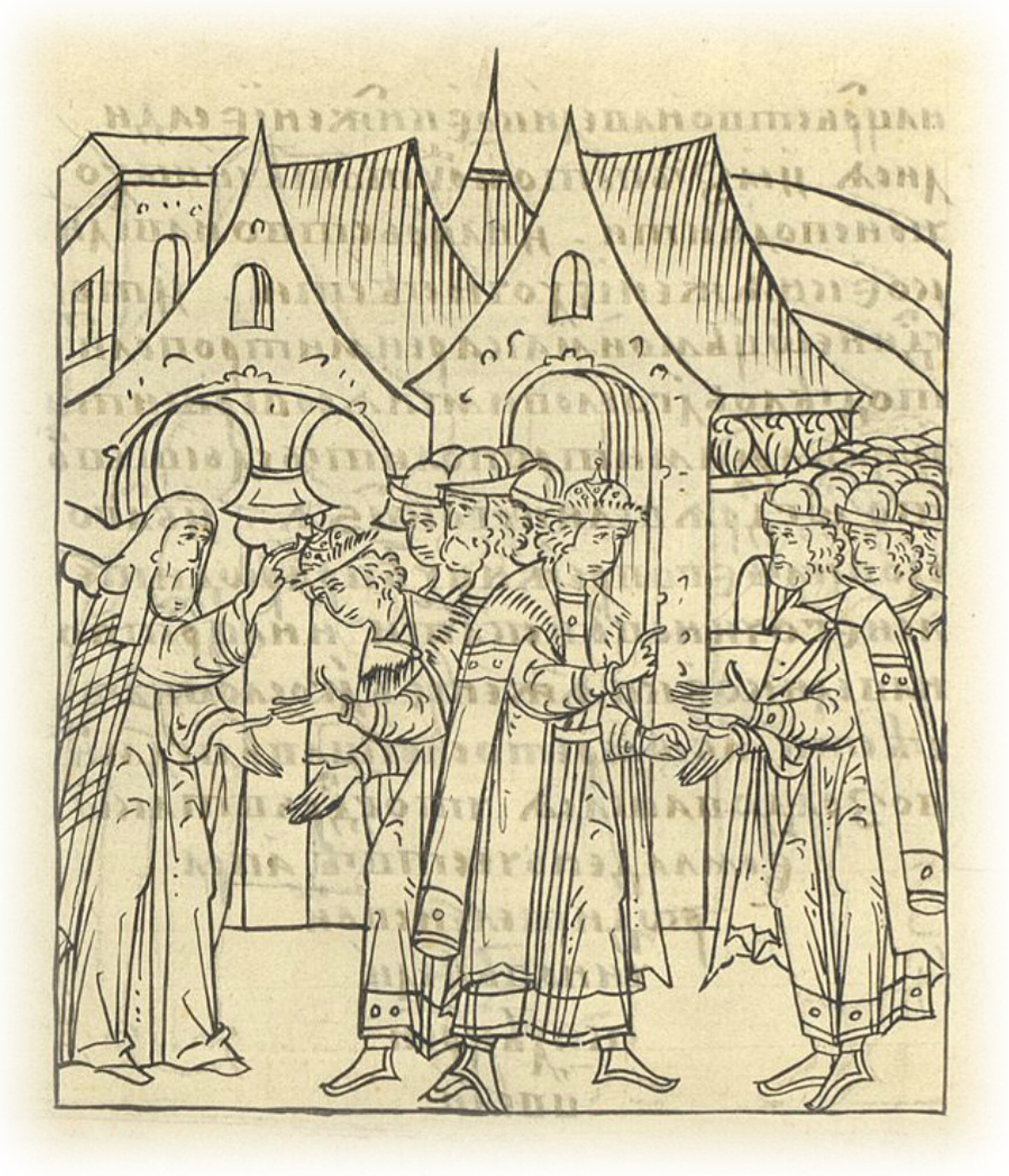 О венчании великого князя Ивана Васильевича всея Руси на царство. И в ту же зиму (месяца) января в 16 день, на (память) поклонения честным веригам святого апостола Петра, вышел великий князь Иван Васильевич всея Руси в свою Столовую брусяную* избу и призвал к себе в избу всех своих бояр, а воеводам и княжатам, и всем своим чиновникам велел собраться перед Столовой избой в сенях в золотом нарядном платье. * сделанная из брусьев.