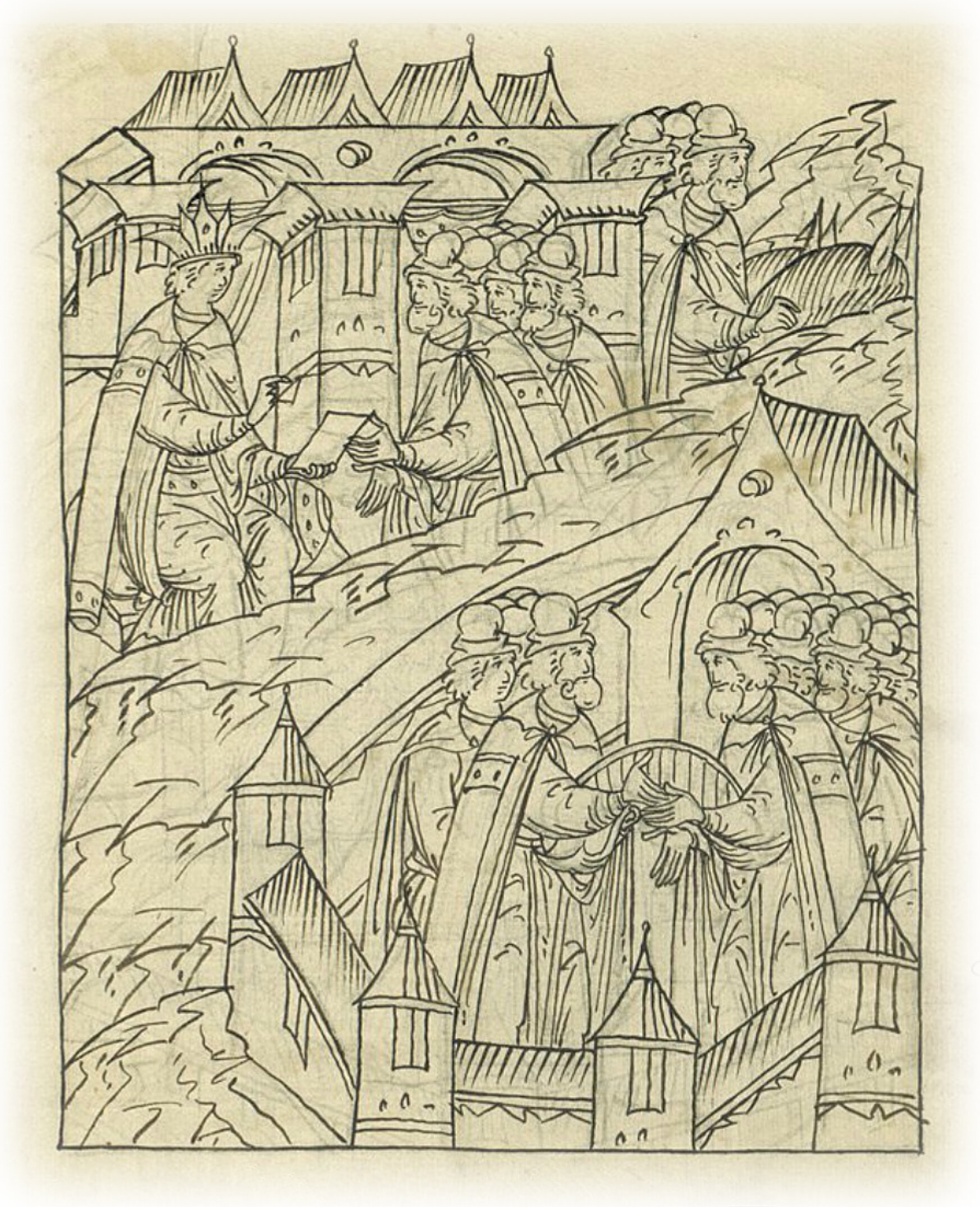 Ругодивские посадники Яким и Захар приезжают в Москву. Воеводы царя Ивана Васильевича Алексей Адашев и Иван Михайлов сообщают им, что государь пожалует их, если сдадут его воеводам помимо Ругодива Вышгород.