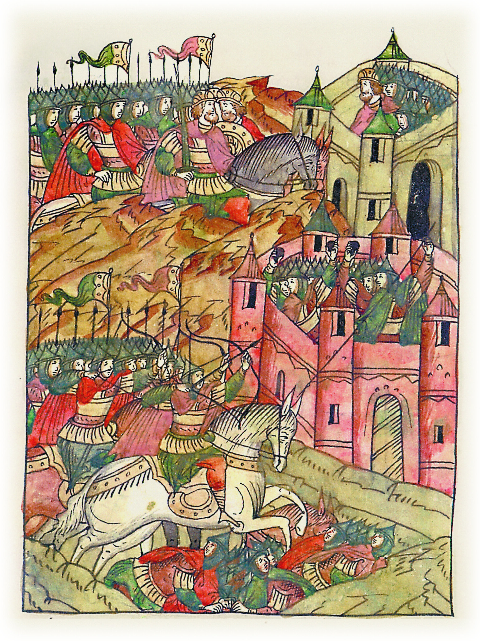 Князь же Мстислав Изяславич, видя их множество и не имея возможности противиться им, затворился в городе; они же пришли и осадили город; он же бился с ними из города, и много с обеих сторон пало.