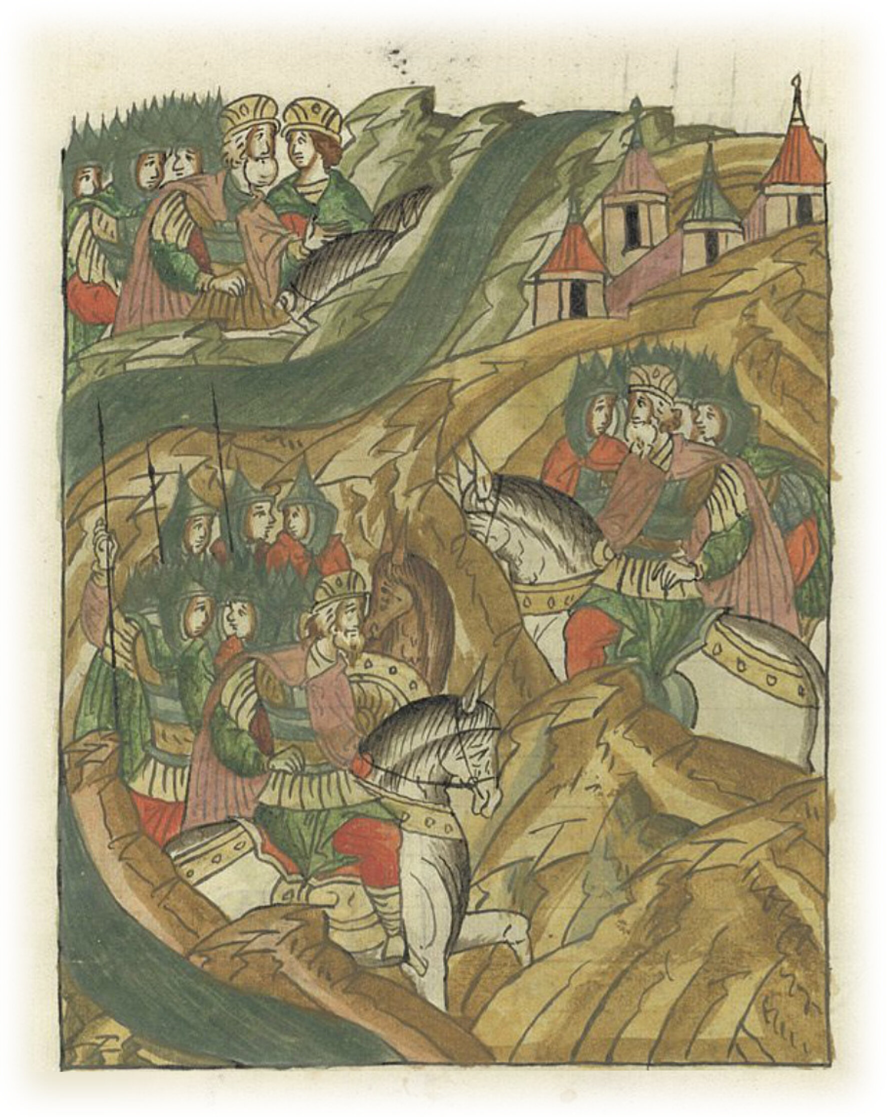 И встал князь Юрий Всеволодович с братьями и со своей силой на реке Гза, а князь Мстислав Мстиславич с князем Смоленским Владимиром Рюриковичем и со всеми силами своими встали близ Юрьева, а князь Ростовский Константин Всеволодович встал на реке Липице со всею силой. С ним были и два доблестных воина: Добрыня Златой пояс, да Александр Попович со своим слугой Торопом, славные богатыри.