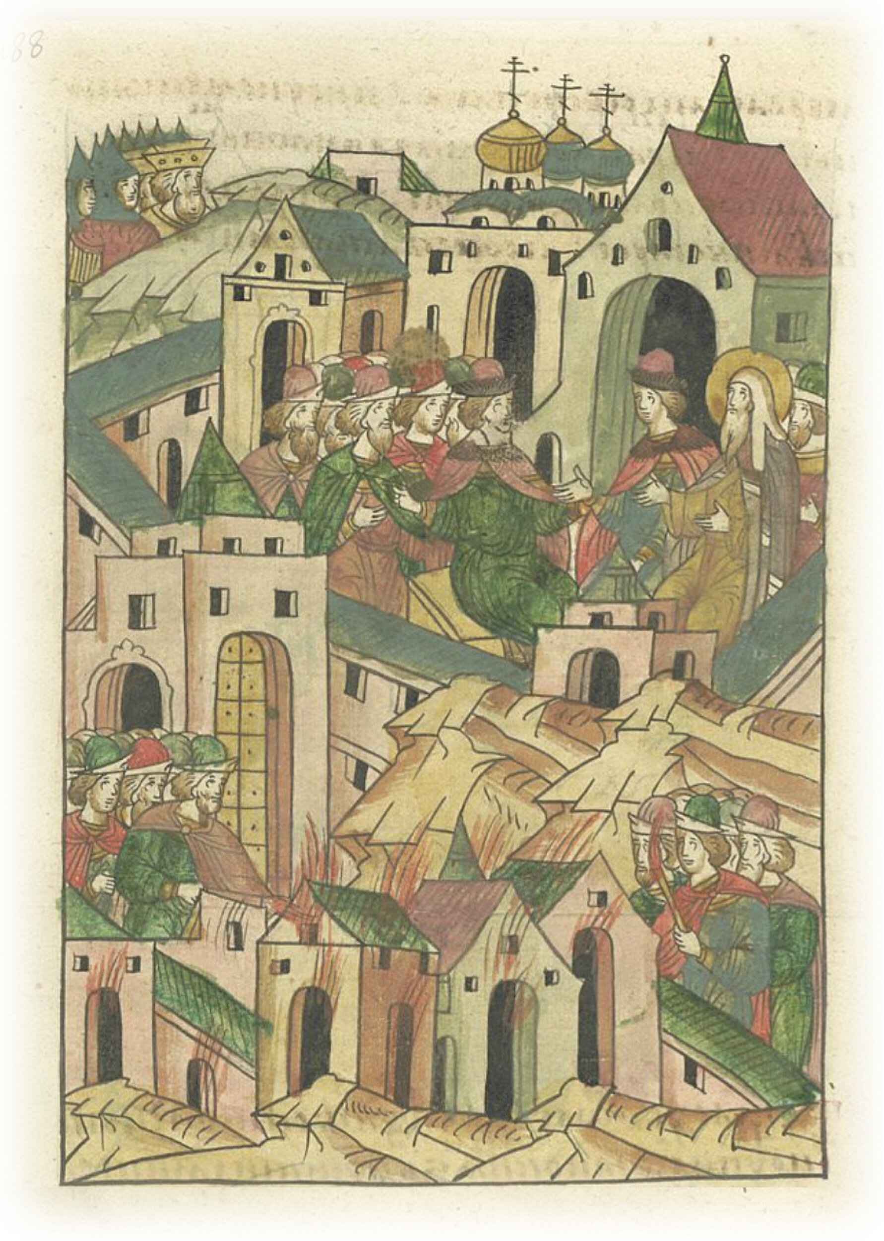 Когда войско Литовского князя Ольгерда встает Москвой, великий князь Дмитрий Иванович велит сжечь посад, а сам затворяется в городе с митрополитом Алексием, своим двоюродным братом князем Владимиром Андреевичем, со всеми боярами и людьми.