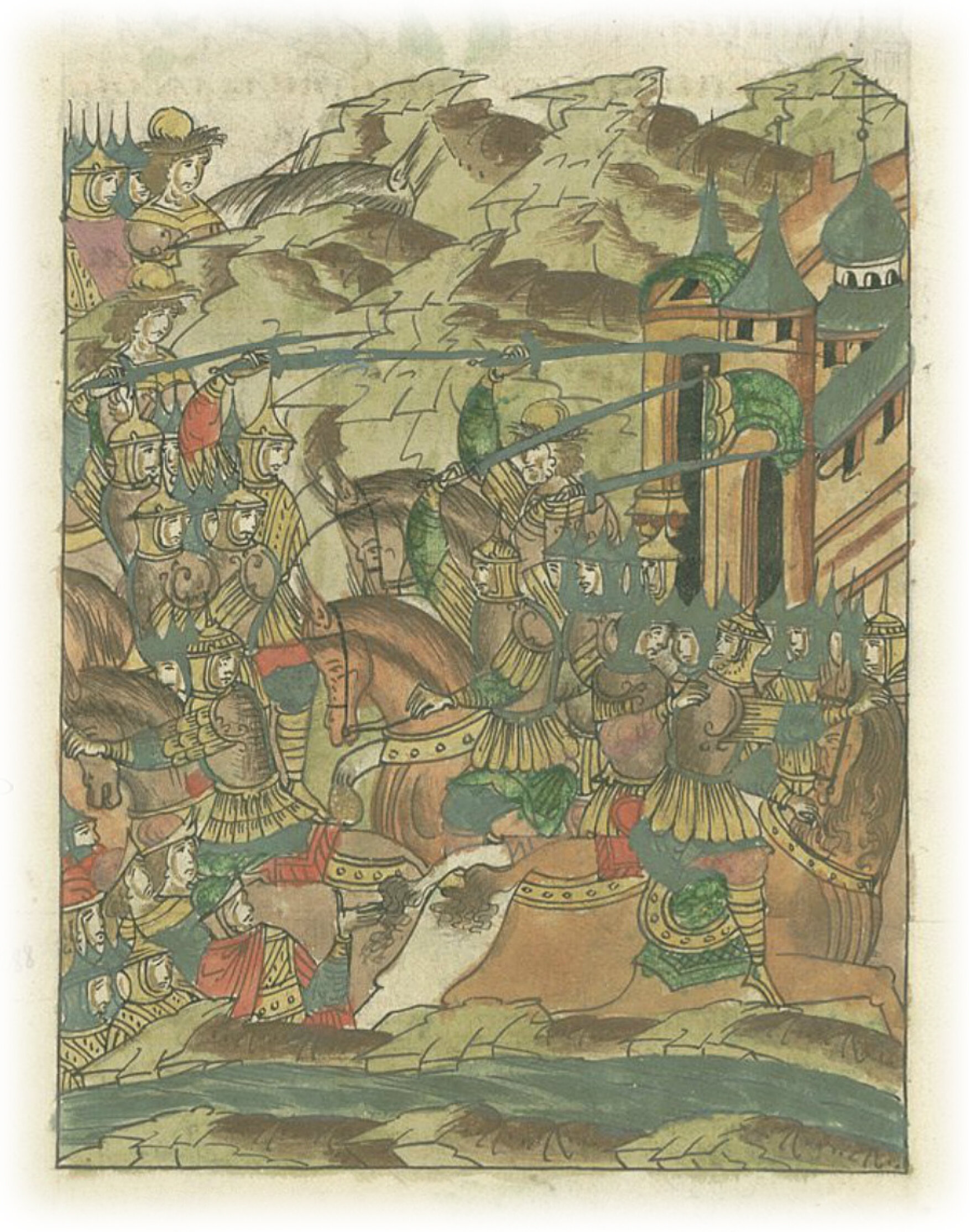 Языки говорят воеводам царя Ивана Васильевича, что магистр окопался большим рвом вокруг города Рындола, бьет из пушек и пищалей и приступает к Рындолу.