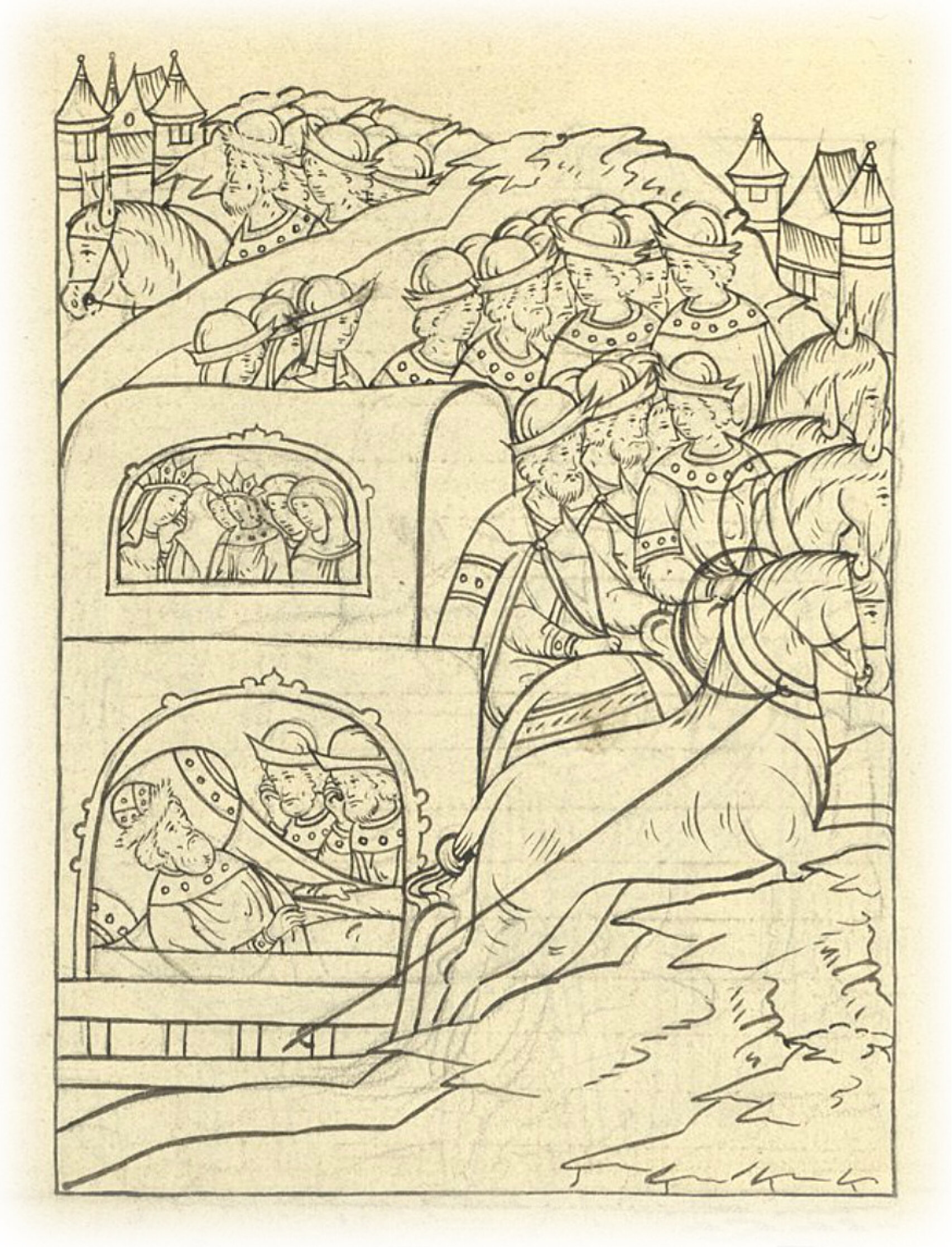 Наутро же князь великий поехал к Москве, а брата своего князя Андрея отпустил в его удел. А великого князя повезли в каптане, а у великого князя в каптане сидели князь Дмитрий Шкурлятев да князь Дмитрий Палецкий. Остановки же великого князя для отдыха были часты.