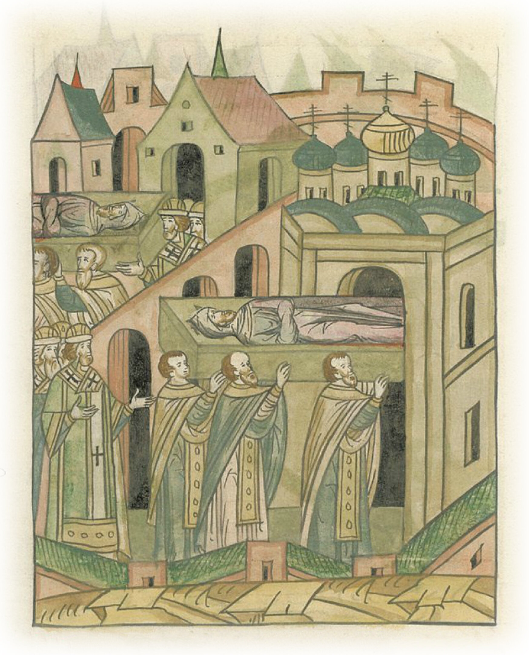 В воскресенье же после утрени пришел митрополит с епископами Сарским и Пермским и со всем освященным собором на двор князя, и, взяв тело его, отнесли в церковь архангела Михаила.