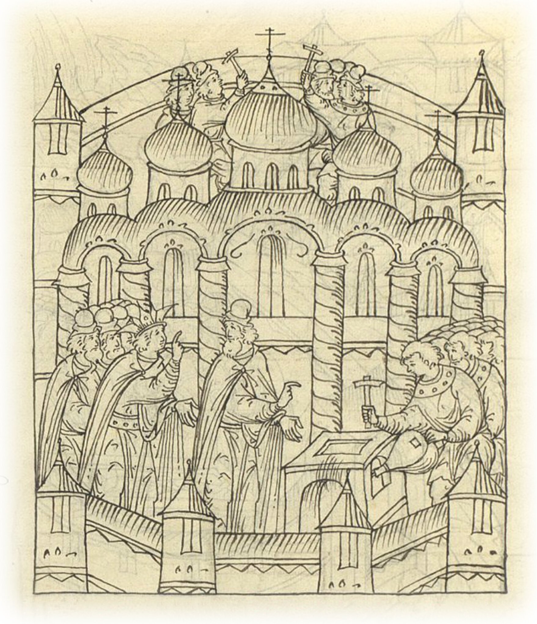 В 7059 (1550) году месяца сентября повелением благоверного и христолюбивого царя и великого князя Ивана Васильевича, всея Руси самодержца, со многим желанием и с великой верой был позолочен большой верх у соборной церкви Пречистой Владычицы нашей Богородицы и Приснодевы Марии Честного и Славного Ее Успения царствующего града Москвы в 18 год его государства, а в 4 год его царства.