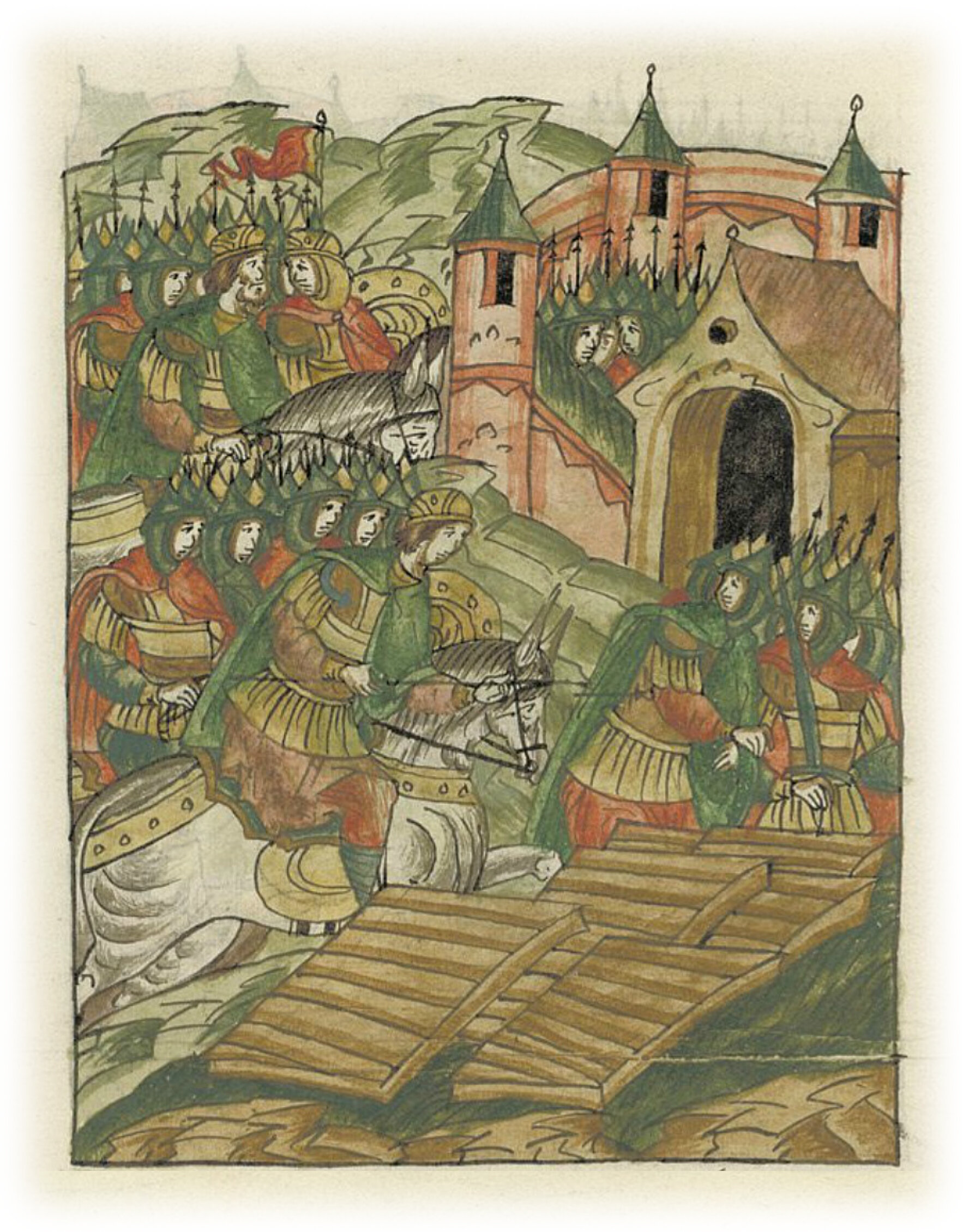 Князь Изяслав Глебович с копьем бежит к плоту, где находятся пешие бойцы, вышедшие из города, а также осадные снаряды. Изяслав загоняет их за плоты к городским воротам и ломает копье.