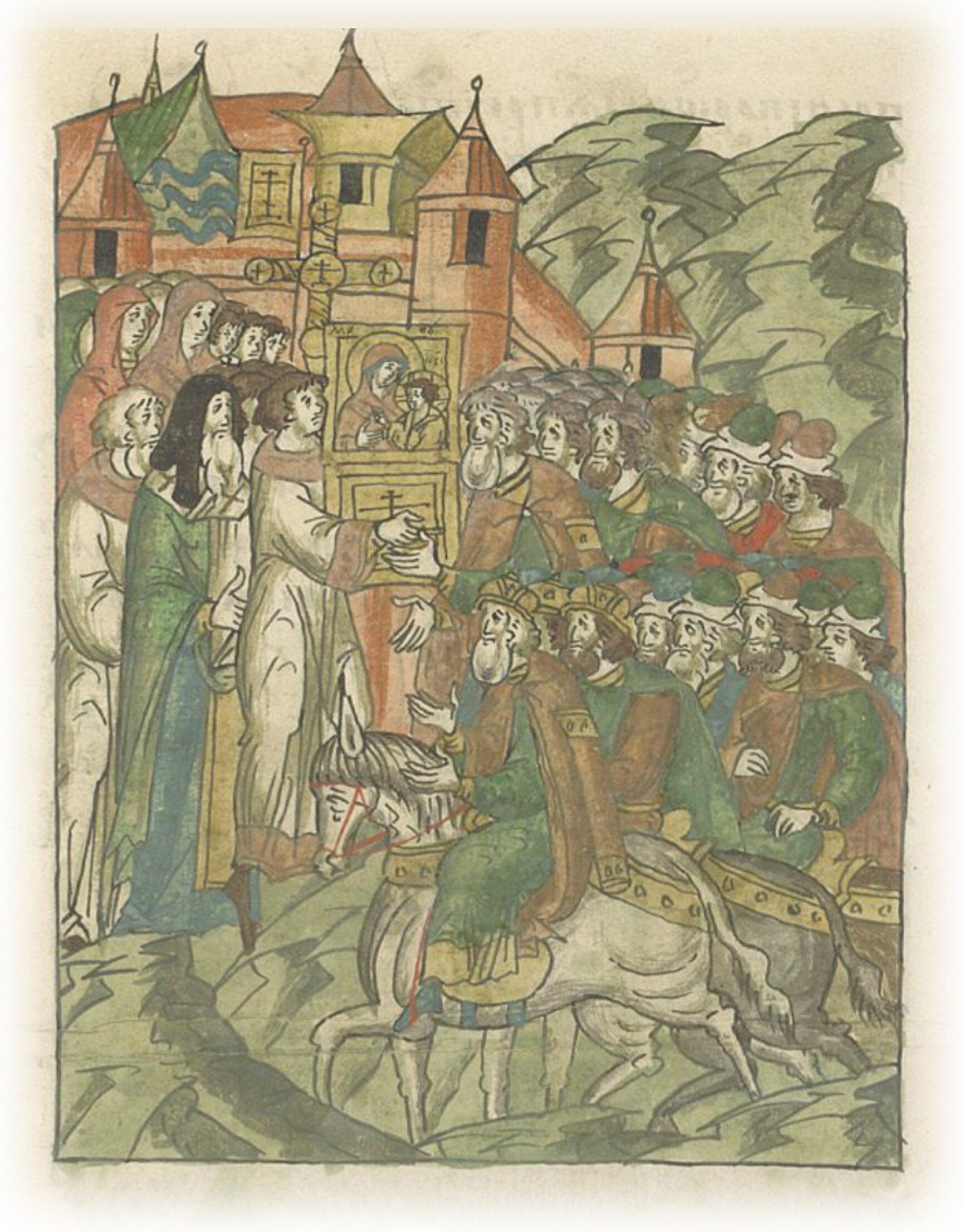 Августа (месяца) в 1 день, в (день праздника) Происхождения честного креста*, великий князь всея Руси Василий Иванович со своими братьями и боярами, и со всеми воеводами, и разных чинов людьми пошел с великой славой в город Смоленск. Епископ же Смоленский Варсонофий с архимандритами и игуменами, священниками и дьяконами, и со всем собором, взяв чудотворную икону пренепорочной пречистой Богоматери с честными крестами и многими святыми образами других святых, вышли навстречу ему. Князья и вельможи благородные, старцы с юношами, матери и девицы, иноки и инокини, и весь народ города Смоленска, малые и великие, мужчины, женщины и дети, со светлыми очами и с чистыми душами, с огромной любовью и усердием встретили государя великого князя за городом на посаде. * Происхождение честных древ.