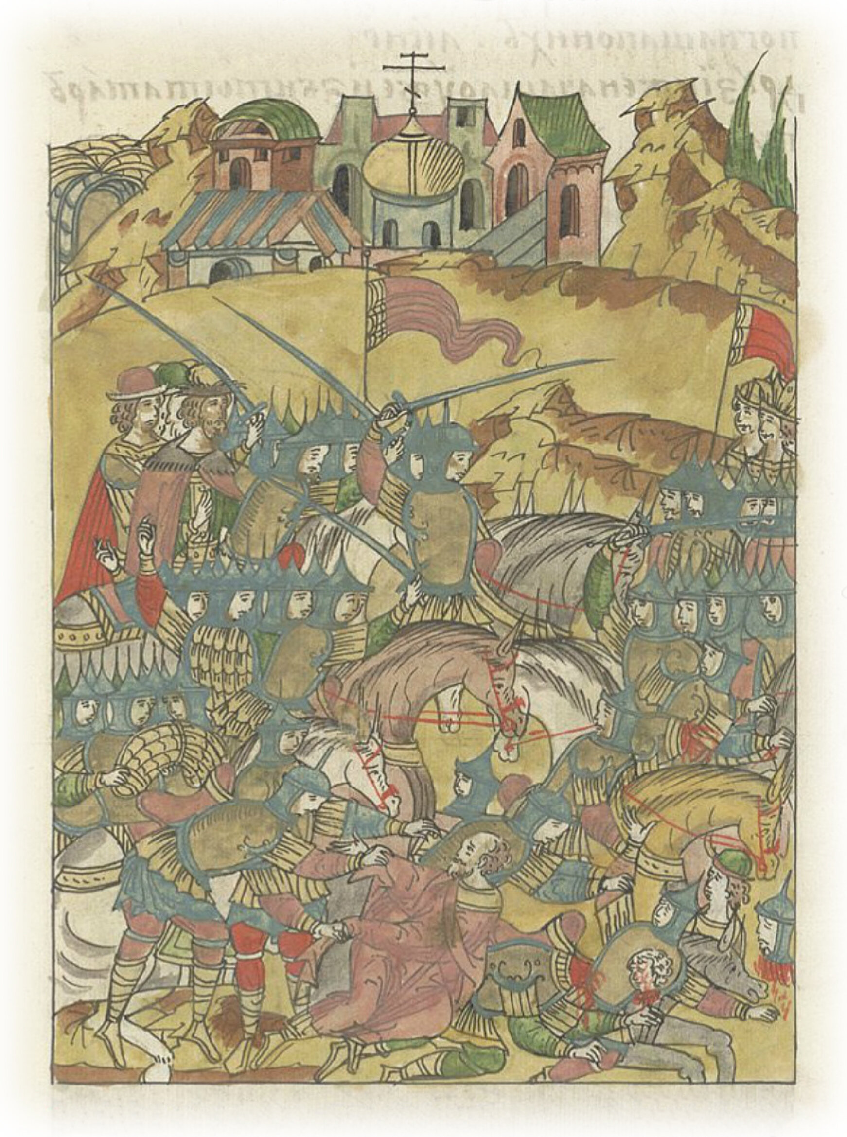 Вышли они на поле близ Ефимъева монастыря по левую сторону и там встретились с окаянными агарянами; появилось их огромное войско перед христианскими полками. Начали они сражение, и сначала стали полки великого князя одолевать, а татары побежали; одних татар наши погнали, а другие сами побежали, другие же наши воины начали грабить уже убитых татар;