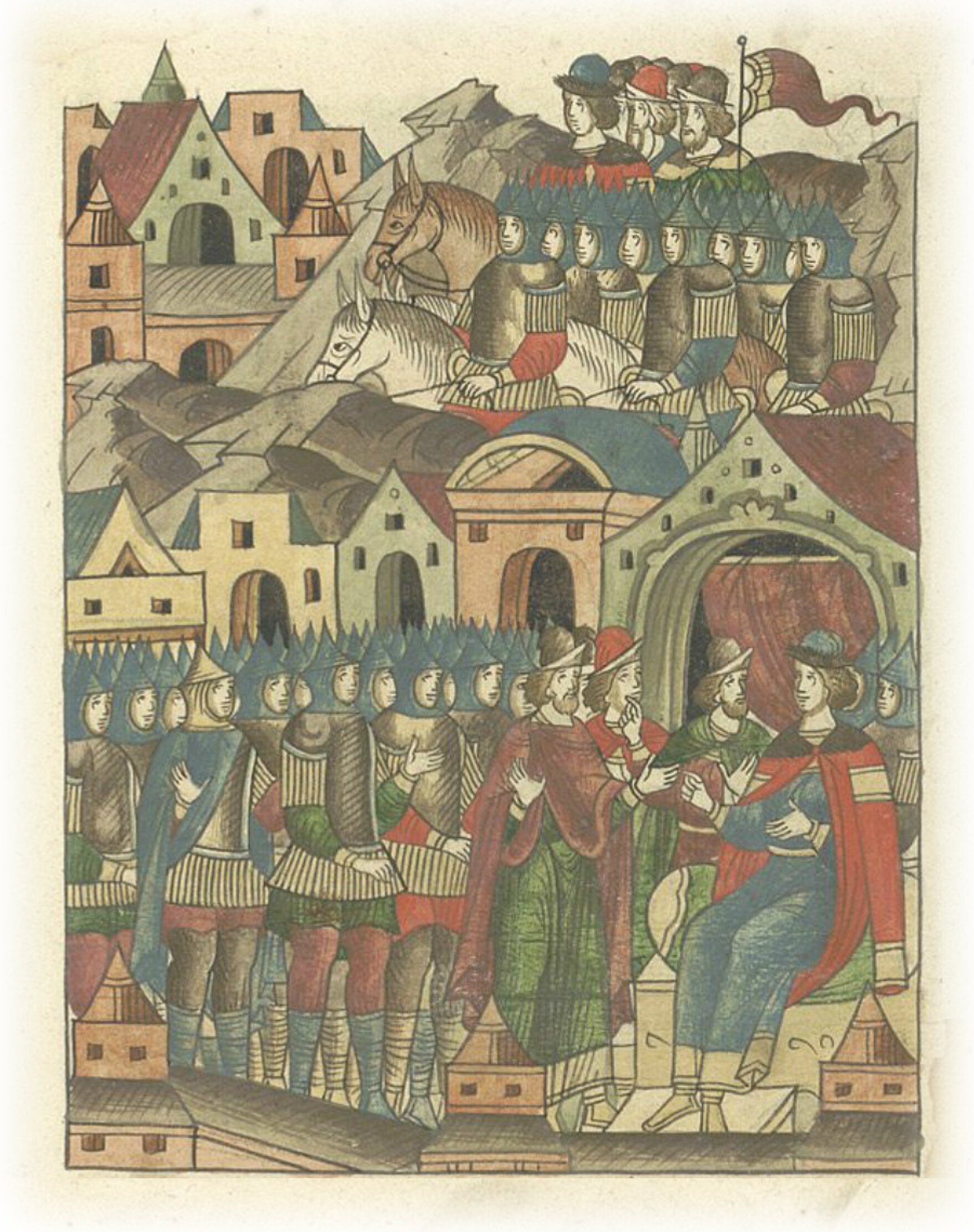 Великий князь Дмитрий Иванович Московский, объединившись со всеми русскими князьями, идет к Волоку.