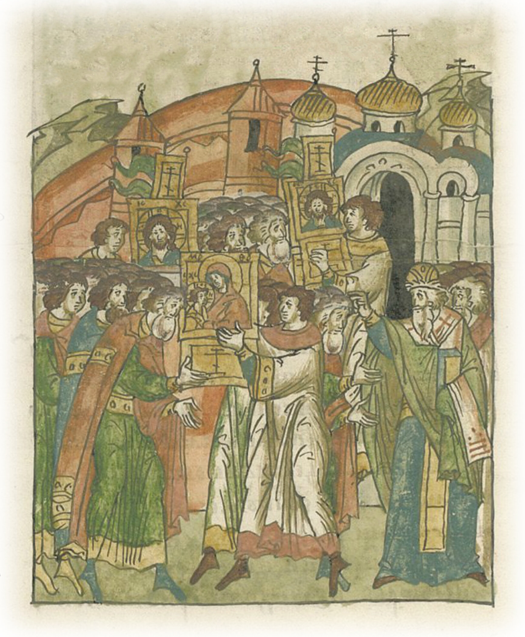 Благоверный же великий государь со своими братьями и со всеми боярами и воеводами перекрестился у честных и святых икон и, получив благословение у епископа Смоленского Варсонофия, пошел за крестами к соборной церкви пречистой Богоматери и славного ее Успения.