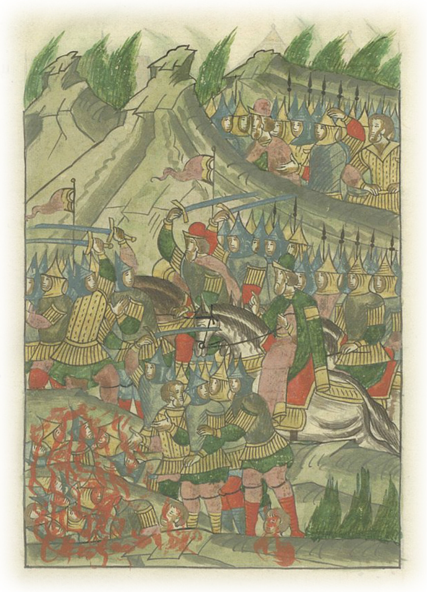 Они, в тот же час вооружившись, пошли против них и бились с ними. И Бог помог воеводам великого князя, и много новгородцев было убито, а иных руками взяли.