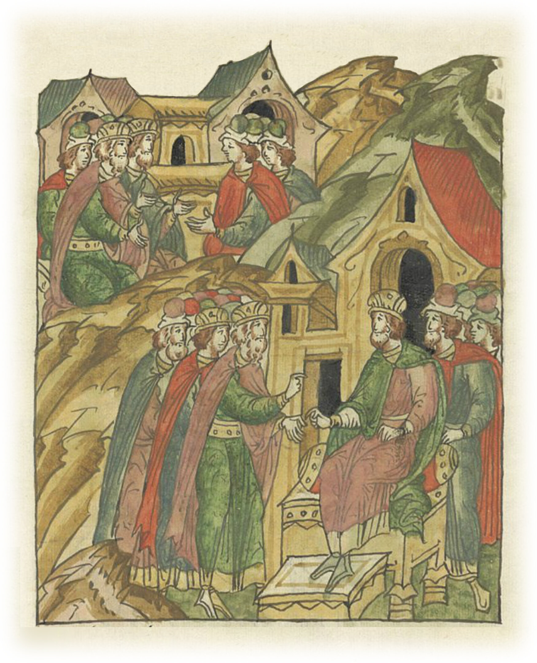 Ругодивские посадники Яким и Захар приезжают в Москву. Воеводы царя Ивана Васильевича Алексей Адашев и Иван Михайлов сообщают им, что государь пожалует их, если сдадут его воеводам помимо Ругодива Вышгород.