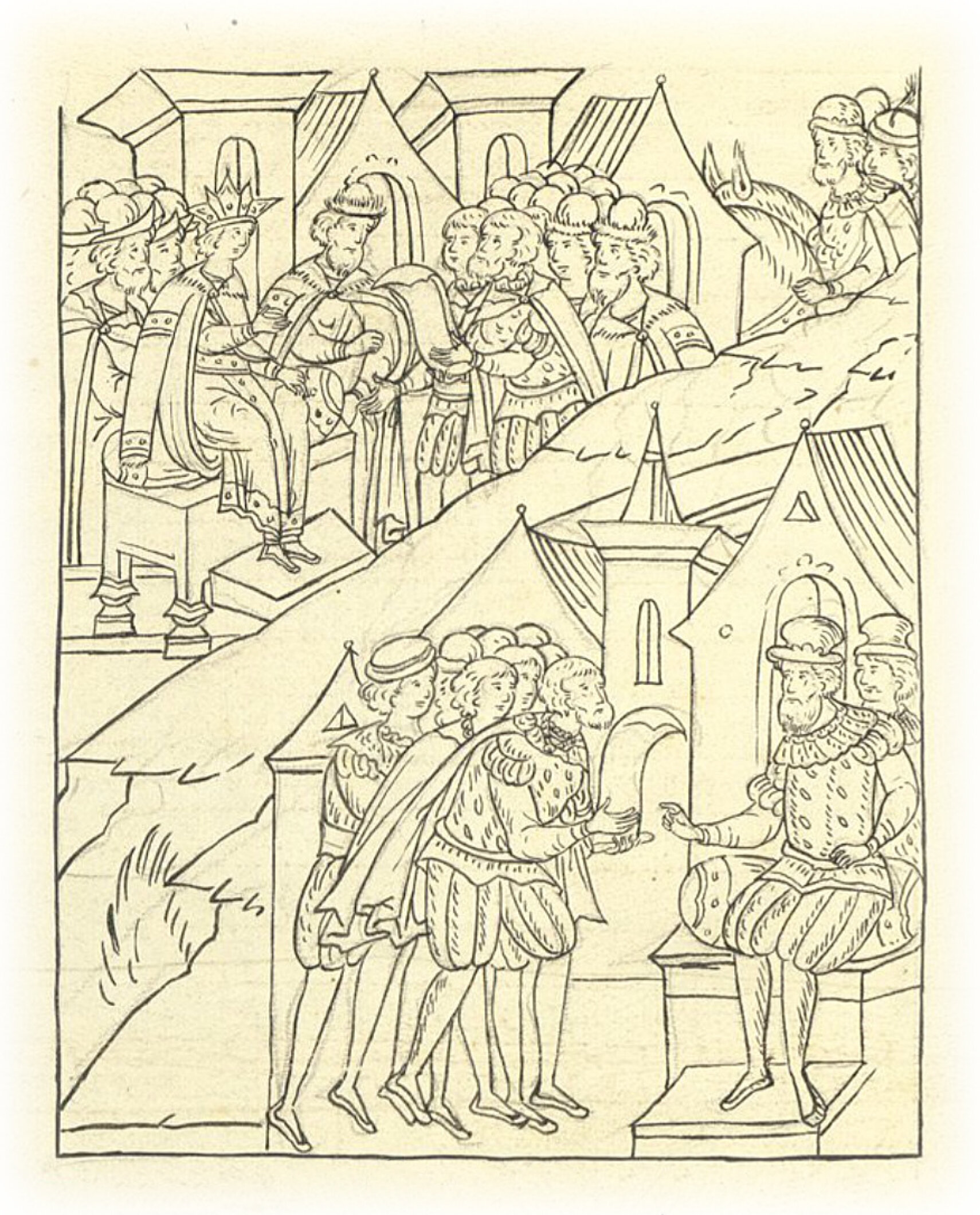 Послы от Ливонского магистра Германа приходят в Москву поздравить великого князя Ивана Васильевича на великом государстве.