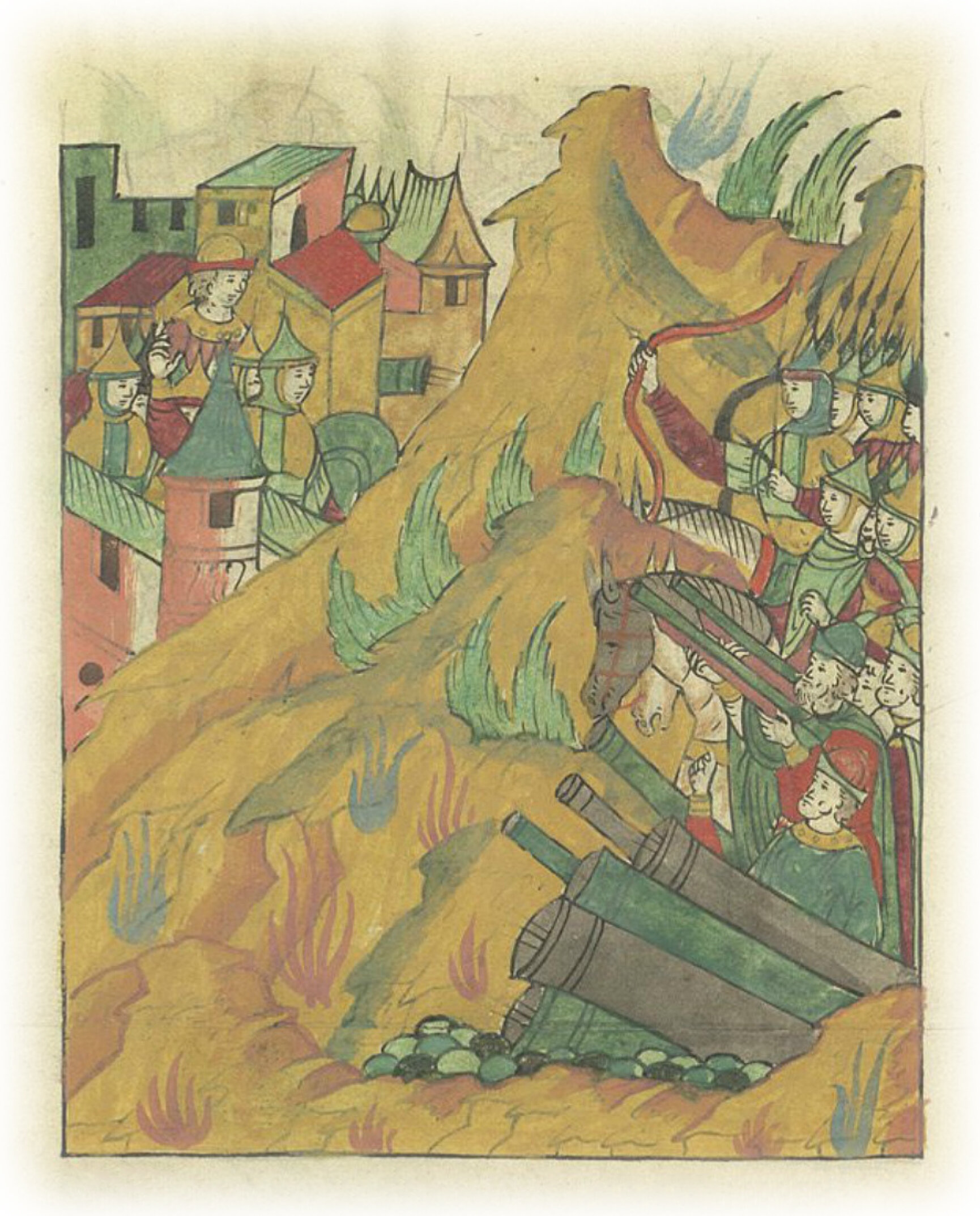 А войску велел приступать к городу с пушками и с пищалями и градобитным нарядом. А в городе в ту пору был великого князя воевода с немногими людьми, Василий Жулебин, правнук Остея из рода Свибловых, а другой– Александр Кобаков, из рязанских бояр.