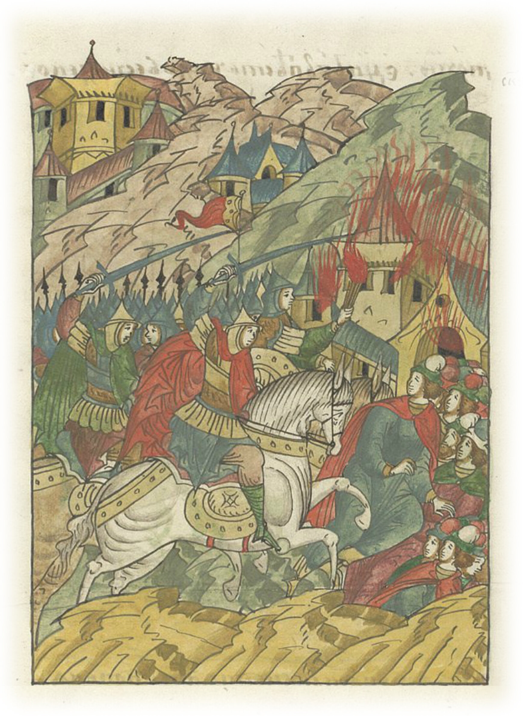 Татары воюют в русских городах и волостях, сжигают их, убивают и берут в плен людей.