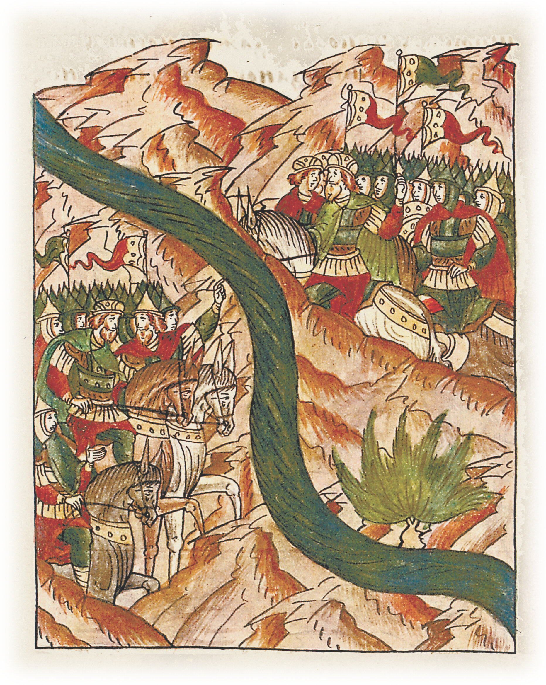 Воеводы царя Ивана Васильевича, разделившись, идут в погоню за царем Емгурчеем.