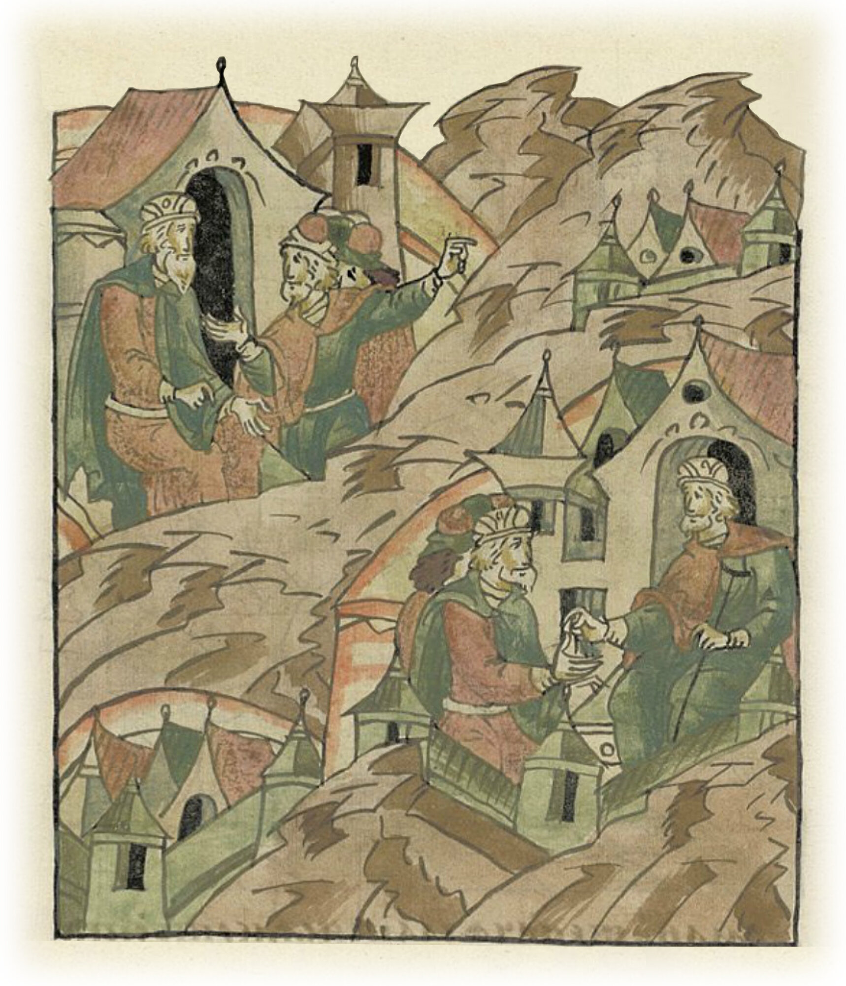 Ругодивские посадники Яким и Захар приезжают в Москву. Воеводы царя Ивана Васильевича Алексей Адашев и Иван Михайлов сообщают им, что государь пожалует их, если сдадут его воеводам помимо Ругодива Вышгород.