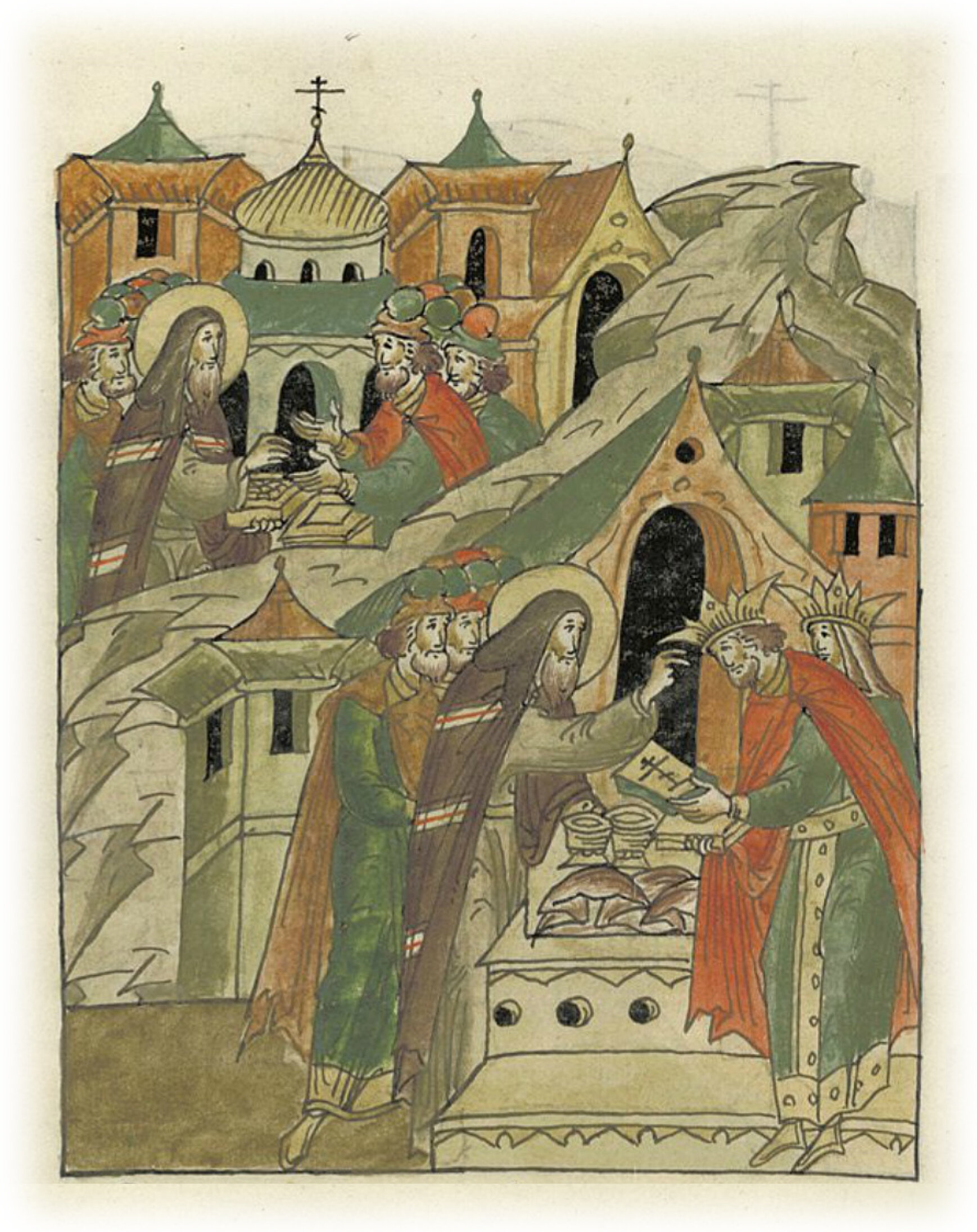 постоянно отыскивал мощи святых, покупал и у царя просил. Царь же одарил его частью Честного и Животворящего Древа и мощами святых, и священными одеждами, и сосудами церковными; дал ему и много золота, чтобы, путешествуя, имел средства на подаяние нищим, нуждающимся и монастырям, говорил ему: «Моли о нас, грешных». Святой же благословил царя и царицу,