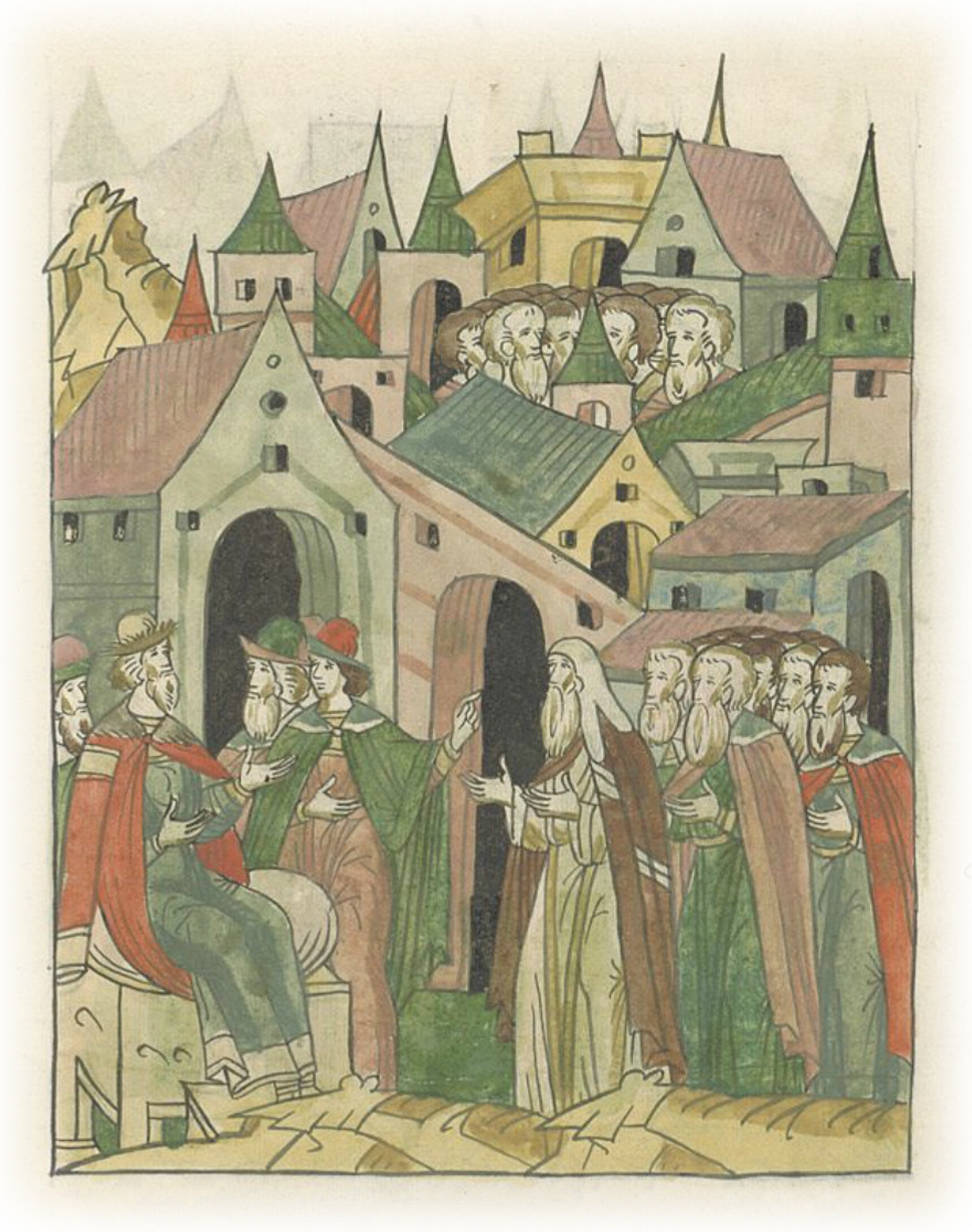 Потом же в третий день во вторник пришел к великому князю на Городище архиепископ Феофил и посадники бить челом от всего Новгорода о взятых боярах, чтобы пожаловал, смиловался, наказание им отменил и на поруки их отдал.