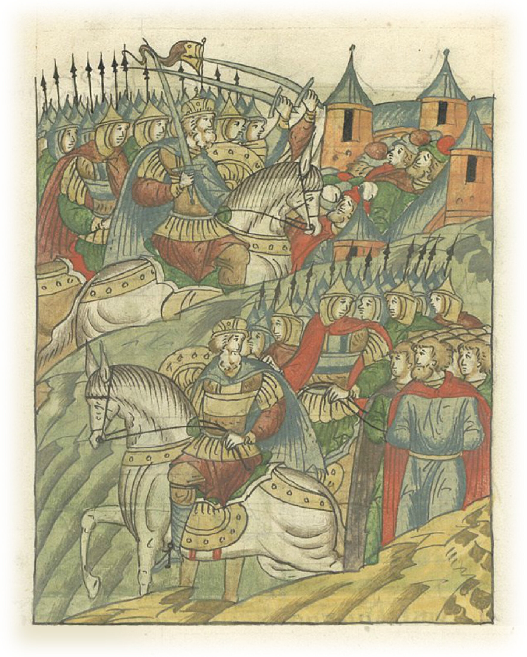 Языки говорят воеводам царя Ивана Васильевича, что магистр окопался большим рвом вокруг города Рындола, бьет из пушек и пищалей и приступает к Рындолу.