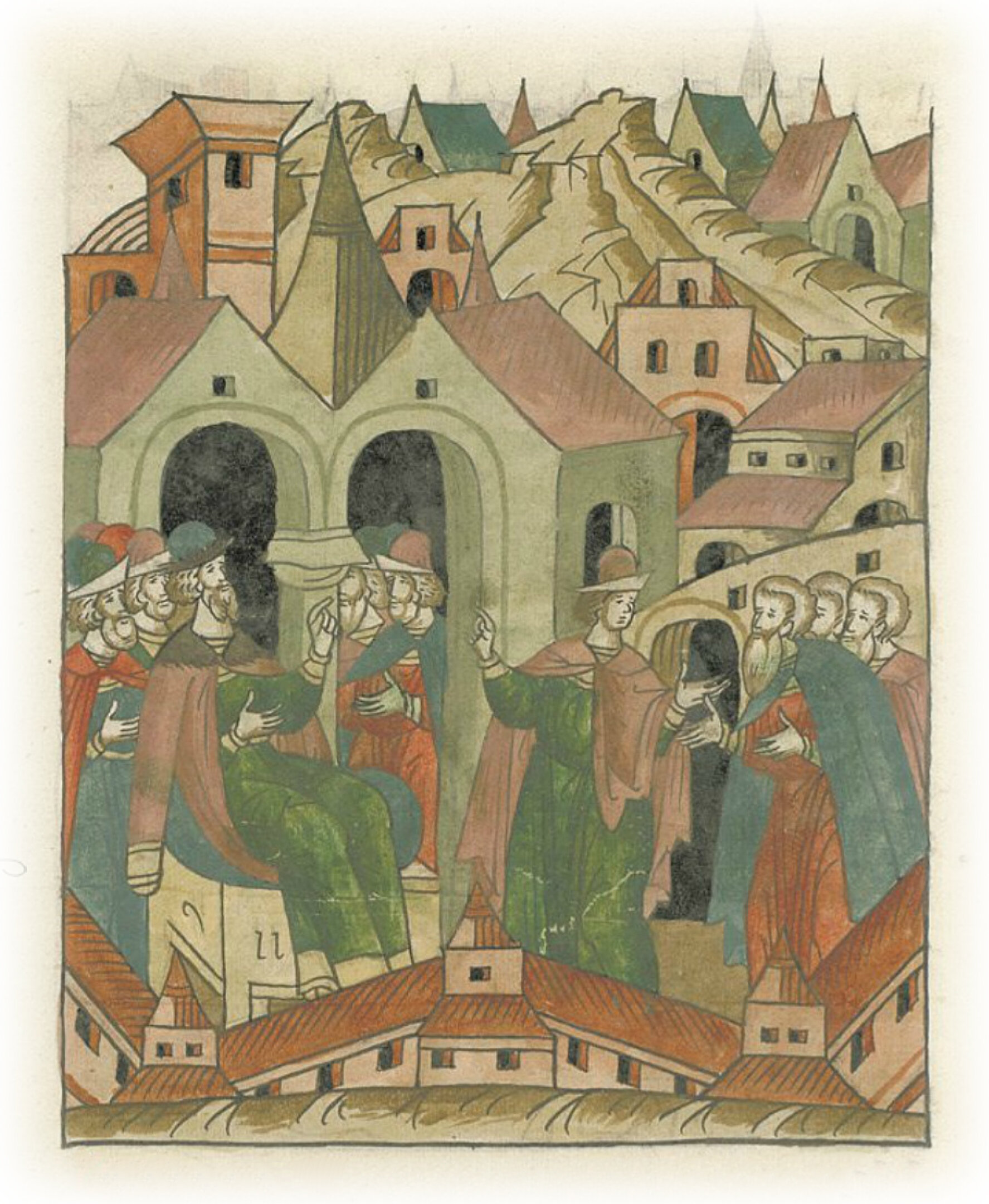 Ругодивские посадники Яким и Захар приезжают в Москву. Воеводы царя Ивана Васильевича Алексей Адашев и Иван Михайлов сообщают им, что государь пожалует их, если сдадут его воеводам помимо Ругодива Вышгород.