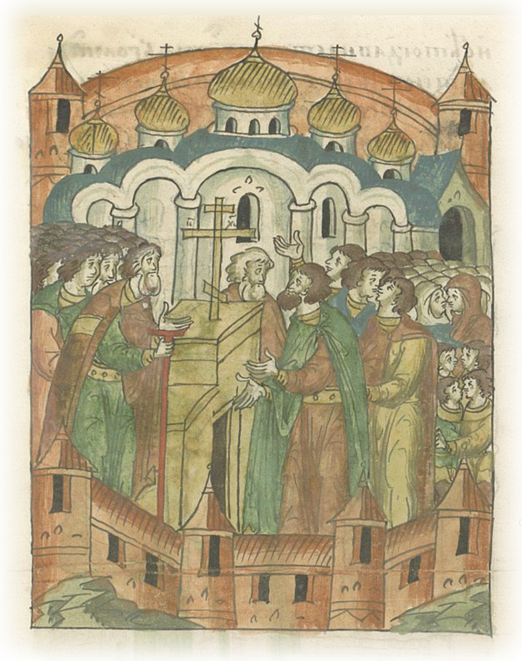 Также поступали и жены между собой, и дети, радуясь и победоносному кресту, и благоверному православному великому государю, испуская благодарственные возгласы об избавлении и освобождении от злой латинской лжи и насилия, и возрадовались своему истинному пастырю и учителю, православному великому государю, и целовали друг друга. И, видя милость пречистой Богоматери и благодать животворящего креста, во всем городе Смоленске люди радовались и веселились.