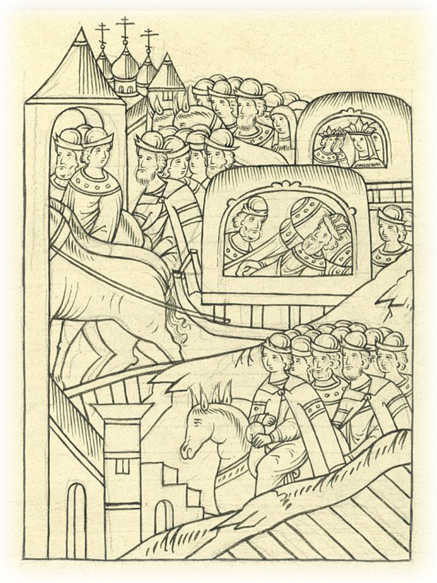 И оттуда же князь великий возвратился и покручинился на городских приказчиков, а опалы на них не положил. И въехал князь великий в славный город Москву в ворота в Боровицкие.