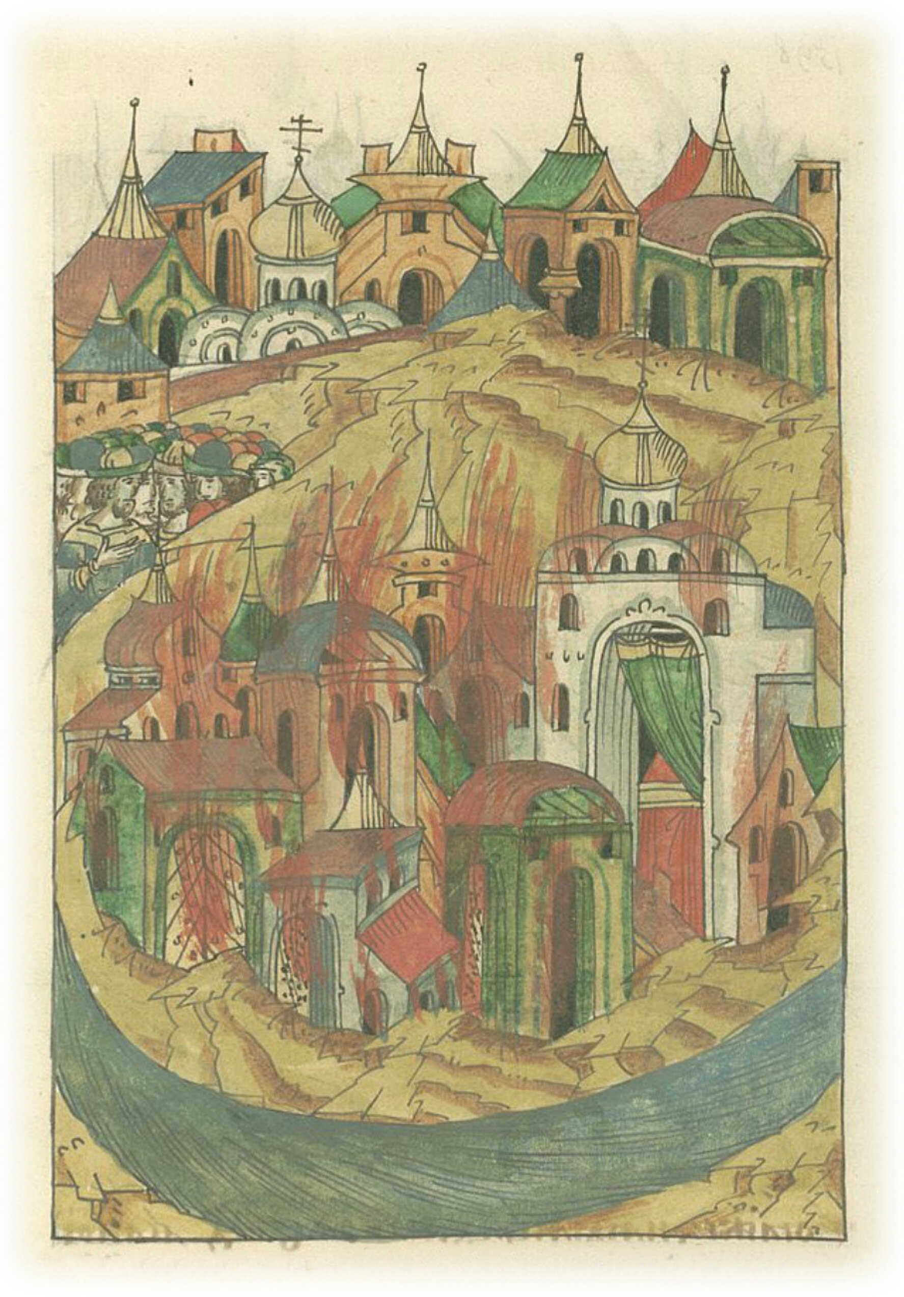 В ту же осень месяца октября в 31 день ночью в Твери сгорел Городок на Волге, церковь Пречистой Богородицы, двор князя, много княжеского имущества, жита и запасов.