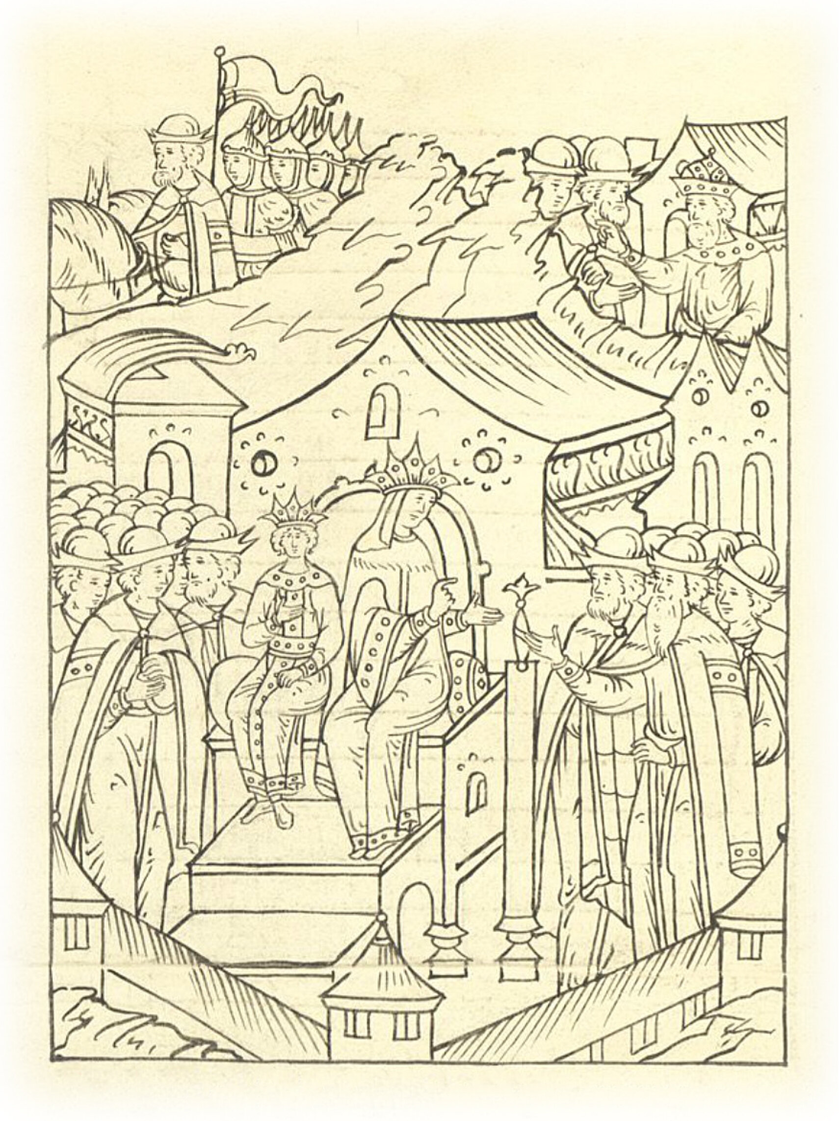 Великий князь Иван Васильевич и его мать великая княгиня Елена переговариваются с боярами о посылке своих воевод против литовцев.