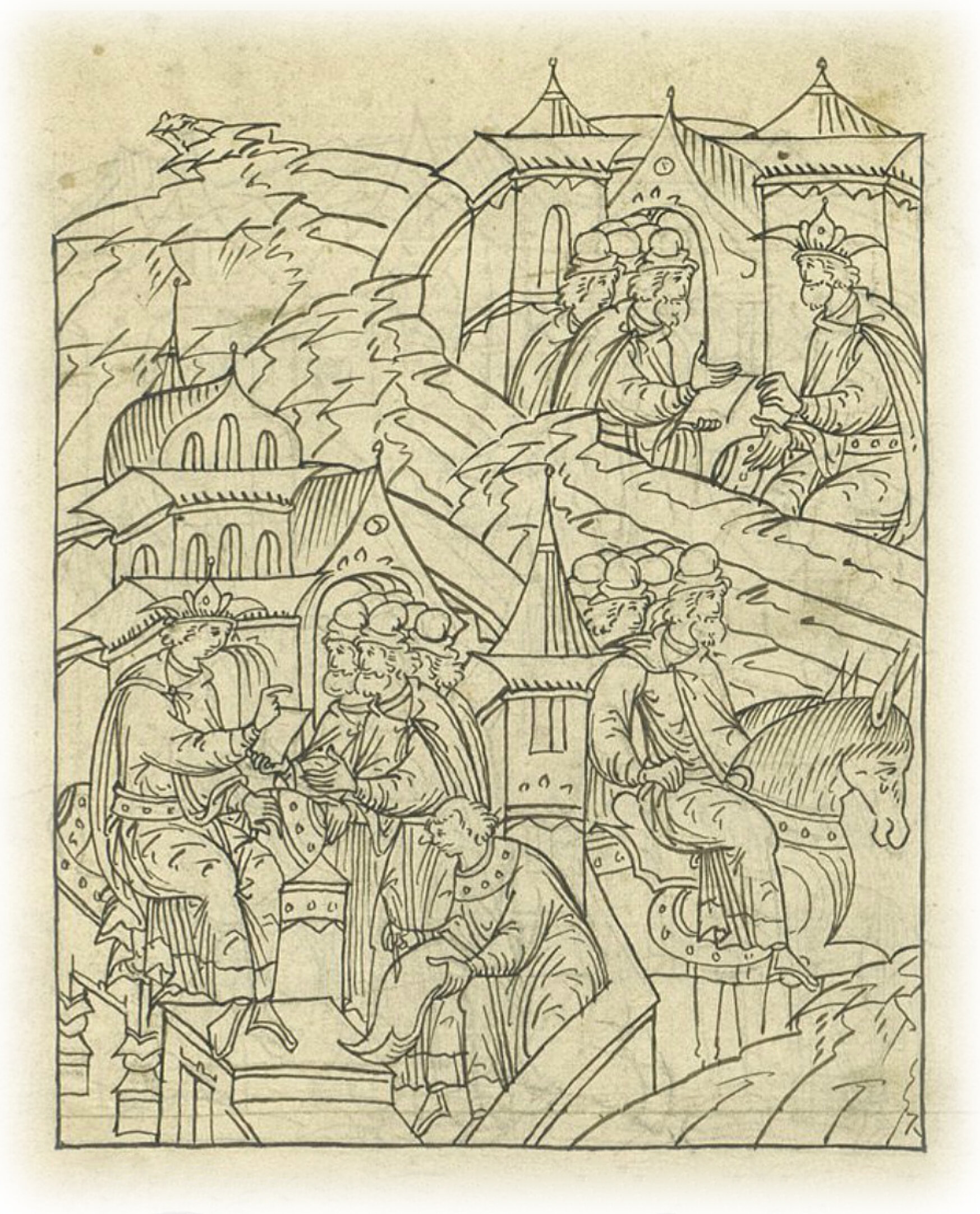 Ругодивские посадники Яким и Захар приезжают в Москву. Воеводы царя Ивана Васильевича Алексей Адашев и Иван Михайлов сообщают им, что государь пожалует их, если сдадут его воеводам помимо Ругодива Вышгород.